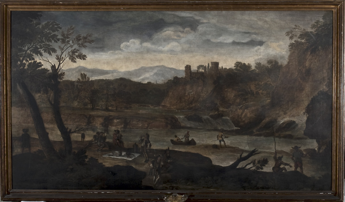 - NOTIZIE STORICO CRITICHE L'opera è stata riconosciuta da Marco Chiarini ("Crescenzio Onofri a Firenze", in "Bollettino d'Arte", LII, 1, 1967, pp. 30-32, in particolare p. 30) come facente parte di un gruppo formato da cinque tele bislunghe di analoghe dimensioni dipinte a tempera da Crescenzio Onofri. Tutti i dipinti sono ricordati nell'"Inventario generale dei mobili di Palazzo Pitti" del 1758 che così li descrive: "Due quadri in tela alti B.a 2 ¾, larghi b.a 4 ¾ per ciascheduno dipintovi a tempera in uno un paese con boschereccio e veduta di città in lontananza, e diverse figure, tra le quali un cacciatore, che tira a germani, et uno che gira un'arrosto di due germani, et una barchetta, con altri cacciatori, e nell'altro un paesino con boschereccio con veduta di rocca sopra un monte, e diverse figurine, che due giocano alle corde con vivande e sopra una tovaglia distesa in terra, et uno, che beve con fiasco in mano, e diversi pescatori ad un fiume con adornamenti scorniciati lisci, e tutti dorati, segnati n. 984", "Due detti simili alti b.a 2 ¾, larghi b.a 5 1/3 in circa dipintovi a tempera in uno paese con boschereccio, e scogli da una parte, e diverse figurine la maggior parte a cavallo, et un calesse con vetturino con due cavalli, e due persone dentro, che uno con una gabbia in mano, e baule dietro e nell'altro paese con boschereccio, e diverse figurine di cacciatori con cani, che uno a cavallo, e diversi pastori con armenti, et altri animali con adornamenti scorniciati lisci, e tutti dorati, segnati n. 985" e "Un quadro di tela alto b.a 2 2/3 largo b.a 6 soldi 8 dipintovi a tempera paese con boschereccio, e veduta di casamenti in lontananza, e varie figurine in diverse attitudini, e due muli carichi con balle, due uomini a cavallo in atto di correre, e diversi animali, con adornamento scorniciato liscio, e tutto dorato segnato n. 986" (ASF, GM Appendice 94, cc. 632v-633r). Dei cinque dipinti descritti nell'inventario del 1758 lo stesso Chiarini ha identificato, oltre all'esemplare in esame, altre tre tele, in deposito anch'esse presso Montecitorio (inv. 1890 nn. 6822, 6840, 8050). La quinta tela, riconosciuta da Silvia Meloni Trkulja (in "Dalle collezioni all'arredo. Opere dei musei negli uffici e nelle sedi di rappresentanza dello Stato", catalogo della mostra [Roma, Complesso monumentale di San Michele, Sala degli Aranci, 8 aprile-11 maggio 1997], a cura di G. Pezzini Bernini, Roma 1997, p. 43, sub 10c), si conserva nei depositi del Museo del Cenacolo di Andrea del Sarto (inv. 1890 n. 6378; OA 09/00454143). L'opera qui considerata è stata ricondotta dal Chiarini al primo periodo fiorentino dell'artista, il quale giunse nella città toscana nel 1689