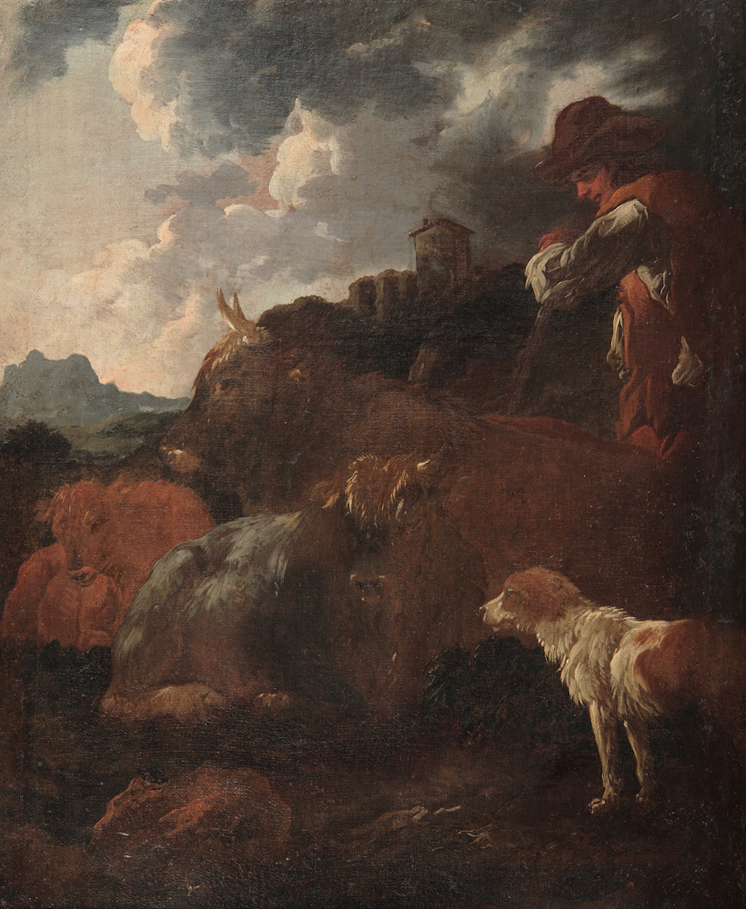 - NOTIZIE STORICO CRITICHE Si deve a Marco Chiarini ('I quadri della collezione del Principe Ferdinando di Toscana', in "Paragone", XXVI, 301, 1975, p. 95 nota 107) il riconoscimento di questo dipinto e del suo pendant (inv. 1890, n. 4789) fra i quadri della raccolta del Gran Principe Ferdinando registrati nell'inventario redatto alla sua morte nel 1713, che così li descrive: "Due quadri in tela alti braccia 1 soldi 6 incirca, larghi braccia 1 incirca per ciascuno, dipintovi di mano di monsù Rosa in uno capre in diverse attitudini et un pastore a sedere, che si appoggia ad un bastone e nell'altro bovi et un cane, con un pastore in piedi e veduta di paese in ciascheduno di essi, con adornamenti scorniciati lisci e tutti dorati, n. 608" (ASF, GM 1222, c. 20r, n. 608). I due esemplari sono descritti con maggiore precisione nell'inventario degli arredi della reggia di Pitti stilato fra il 1697 e il 1708: "Due quadri compagni del medesimo autore [cioè Monsù Rosa], che in uno nel davanti vi sono due caproni a diacere pezzato uno di scuro e l'altro bianco, con un capretto bianco da una parte che si vede dal mezzo avanti con certe erbaccie, giù dall'altra parte vi è un pastore a sedere in terra vestito con pelliccia con maniche turchine, calzoni scuri e calze bianche con capello in capo e mazza in mano che tutto appoggiato con le reni ad un masso, su il quale vi è un cane pezzato bianco e nero e nell'indietro vi è un albero con monti e su la mano sinistra vi è un pezzo di grotta e di torraccia mezze rovinate, con una casa, con altri monti in lontananza, alto braccia uno e soldi cinque e quattro, largo braccia uno a quattro quattrini. Nell'altro nel davanti vi sono due bovi a diacere, che uno bianco sudicio e l'altro rosso scuro et una vitella rossa pure a diacere con alcune erbaccie et un cane pezzato rosso e bianco del quale non si vedono le gambe di dietro e giù basso vi sono alcuni sassi con un poco d'acqua nell'indietro su la mano destra, vi è un pastore in piedi con camiciola giallognola stracciata, in maniche di camicia, calzoni rossi, capello in capo vecchio si appoggia con le mani ad una mazza, vi è un monte su il quale vi è una casa e su la mano sinistra vi sono monti in lontananza, alto braccia uno e soldi sei e, mezzo, largo braccia uno, e un mezzo soldo" (ASF, GM 1185, cc. 1048-1049, n. 608). Il Gran Principe Ferdinando fu un grande estimatore dei 'paesi' di Philipp Peter Roos, spesso animati da animali al pascolo resi con pochi, ma sicuri, tocchi di pennello. Oltre alle due opere già citate, Ferdinando possedeva altri sei lavori di questo maestro, tutti ricordati nel suo appartamento nel 1713 (M. Chiarini, 'I quadri della collezione del Principe Ferdinando di Toscana', in "Paragone", XXVI, 301, 1975, pp. 76-78; M. Chiarini, 'I quadri della collezione del Principe Ferdinando di Toscana', in "Paragone", XXVI, 305, 1975, pp. 57-58)