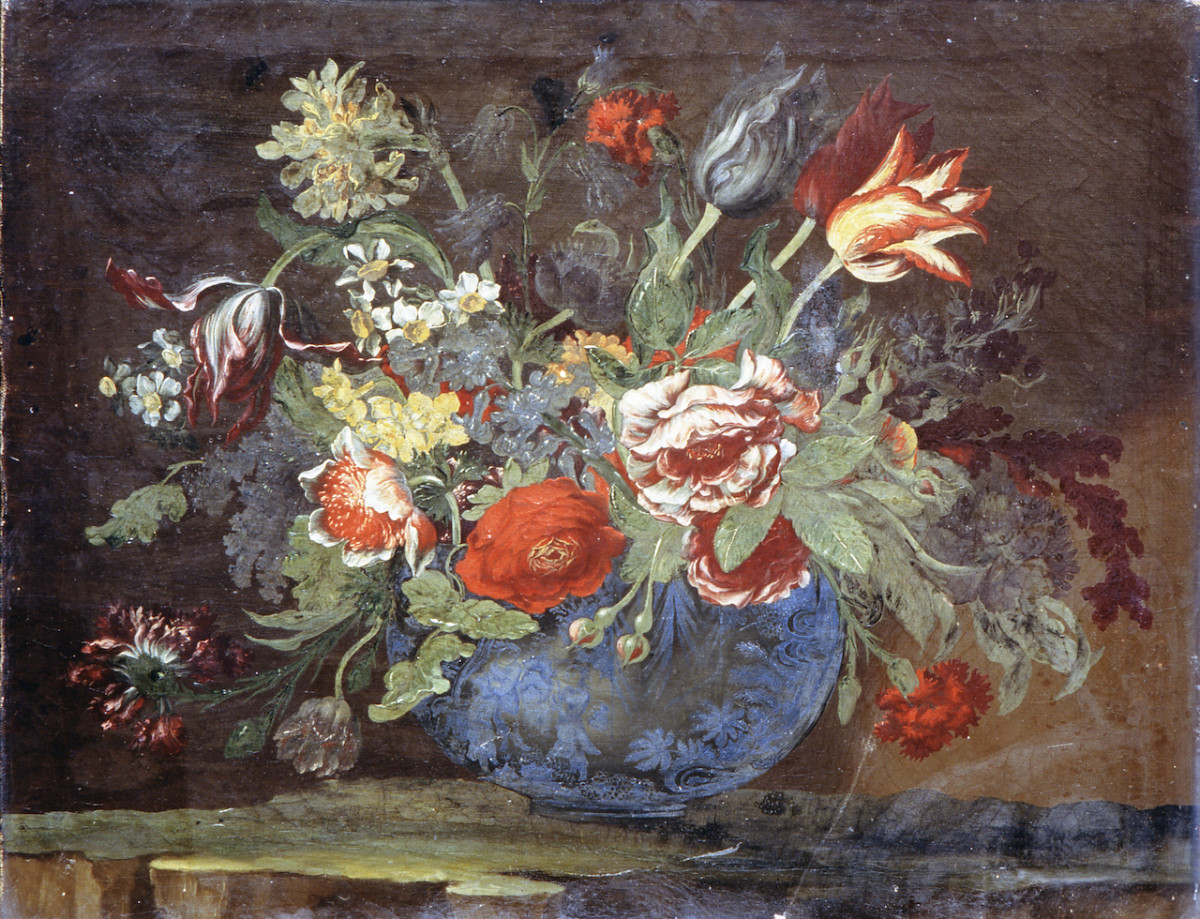 - NOTIZIE STORICO CRITICHE L'opera fa parte di un gruppo di quattro tele raffiguranti raffinati contenitori di porcellana cinese con fiori posati direttamente a terra (inv. 1890, nn. 4831, 4832, 4833, 4834), tutte concesse in deposito alla Camera dei Deputati dal 1925. Restituiti ad Andrea Scacciati da Giuliano Briganti ("Il Palazzo di Montecitorio", Roma 1967, p. 260), i dipinti sono stati oggetto di approfondite ricerche di archivio da parte di Riccardo Spinelli (in "La natura morta a palazzo e in villa. Le collezioni dei Medici e dei Lorena", catalogo della mostra [Firenze, Palazzo Pitti, 2 luglio-31 ottobre 1998], a cura di M. Chiarini, Livorno 1998, p. 160, nn. 79-80). Lo studioso ha appurato che essi sono quanto resta di una serie di sei ricordata nell'inventario della villa del Poggio Imperiale del 1692 che così la descrive: "Sei quadri in tela alti soldi 19 larghi b. 1 ¼ dipinto di mano dello Scacciati, in ciascheduno di essi, una catinella di porcellana, entrovi più e diversi fiori al naturale, ch'en uno di detti sul piano vi è un fingo stravagante, in altro un gran fiore giallo con gambo lungo, et in altri alcuni fiorellini, con adornamento di legno tutti scorniciati tinti di nero w filettati d'oro, con foglie simili su le cantonate, alti b. 1 1/5, larghi b. 1 ½ (ASF, GM 995, c. 50v, n. 322). A quell'epoca le tele erano collocate in una delle camere dell'appartamento al piano terreno della villa messo a disposizione del cardinale Francesco Maria de' Medici dalla madre Vittoria della Rovere. Proprio la granduchessa, appassionata collezionista di nature morte, fu la committente delle opere: quattro delle sei "catinelle finte di Porcellana con fiori" vennero pagate ad Andrea Scacciati l'8 gennaio 1683 (stile comune); le altre due il 21 luglio dello stesso anno. Per quanto riguarda i due esemplari della serie oggi non più reperibili nelle collezioni delle Gallerie fiorentine, Sandro Bellesi ha recentemente reso noto uno di essi apparso sul mercato anglosassone (S. Bellesi, "Studi sulla pittura e sulla scultura del '600-'700 a Firenze", Firenze 2013, pp. 79, 81, fig. 54)