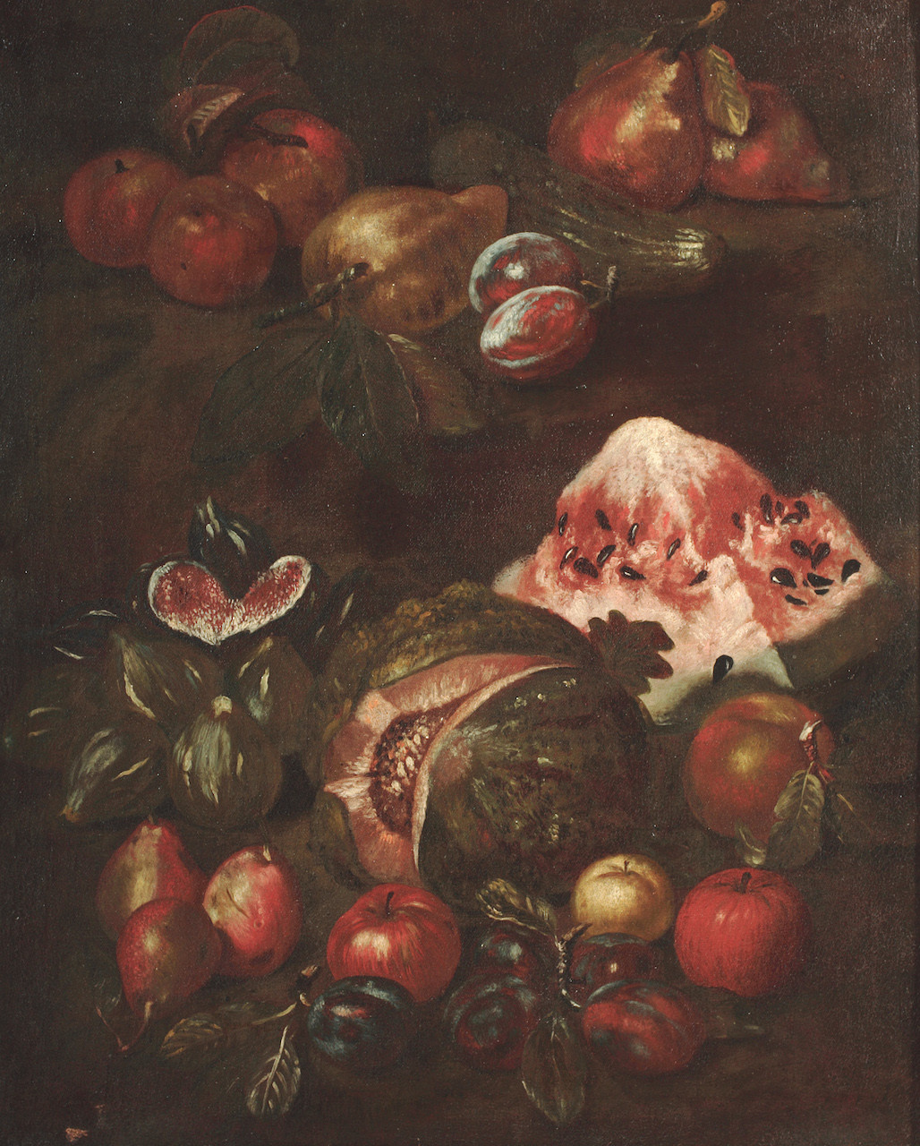 - NOTIZIE STORICO CRITICHE L'attribuzione della tela a un artista vicino a Bartolomeo Bimbi e forse operante nella sua bottega si deve a Ilaria Della Monica ("Il granducato di Cosimo III. 1670-1723", in Il giardino del granduca. Natura morta nelle collezioni medicee, a cura di M. Chiarini, Torino 1997, pp. 207-237, in particolare p. 230). L'opera è stata accostata dalla stessa studiosa ad altre due nature morte con frutta delle Gallerie fiorentine (inv. 1890, nn. 6406 e 7635), anch'esse in deposito a Montecitorio