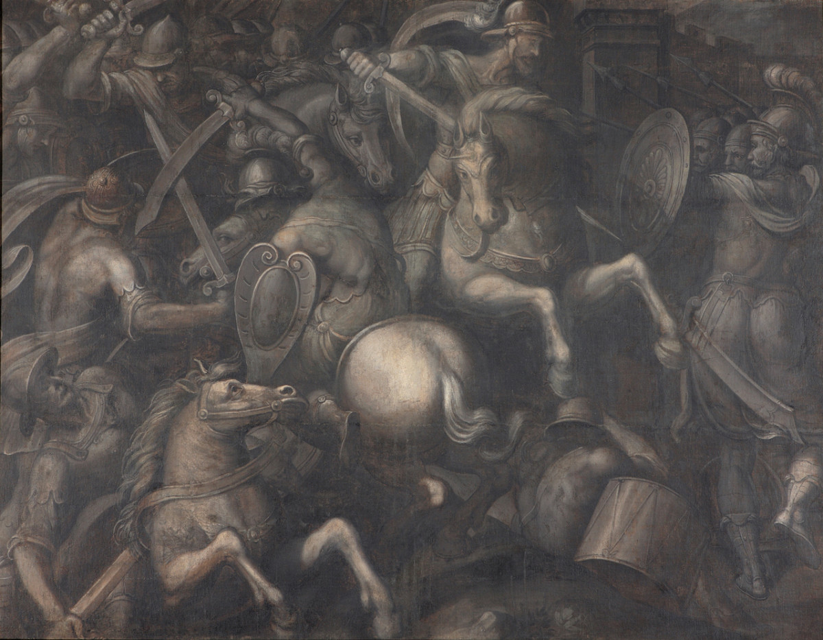 - NOTIZIE STORICO CRITICHE L'opera fa parte della serie di grandi monocromi commissionati dal granduca Cosimo II per l'apparato funebre allestito in San Lorenzo in onore di Enrico IV re di Francia e di Navarra, marito di Maria de' Medici, assassinato a Parigi il 14 maggio 1610. I documenti resi noti da Eve Borsook nel 1969 (pp. 201-234) attestano i nomi dei ventisei pittori chiamati a realizzare le tele, riprodotte in incisioni di Alovisio Rosaccio poste a illustrare il volume di Giuliano Giraldi dedicato alla descrizione dell'apparato funebre e stampato per l'occasione nel 1610. Delle ventisei tele eseguite per il ciclo se ne conservano diciannove, di cui diciassette nelle collezioni delle Gallerie fiorentine e due in collezione privata. Associato in passato alla battaglia di Coutras (20 ottobre 1587), il soggetto della tela qui considerata è stato identificato con una più generica rappresentazione dei 'Combattimenti e vittorie di Enrico IV' celebranti le sue doti di combattente. La fonte di ispirazione della composizione è probabilmente da ricercare in un bassorilievo antico. L'opera è stata attribuita a Ulisse Giuochi da Monica Bietti (in "Parigi val bene una messa. 1610: l'omaggio dei Medici a Enrico IV re di Francia e di Navarra", catalogo della mostra [Firenze, Museo delle Cappelle Medicee, 16 luglio-2 novembre 2010; Pau, Musée national du château de Pau, 1 aprile-30 giugno 2010], a cura di M. Bietti, F. Fiorelli Malesci, P. Mironneau, Livorno 2010, pp. 128-129, n. 8) sulla base del confronto con altri lavori documentati o riferiti all'artista come la 'Partenza di margherita d'Austria da Graz' del ciclo di Margherita d'Austria o la 'Visitazione della Vergine' in San Clemente a Pelago (datata e firmata). Nella relativa incisione di Alovisio Rosaccio sotto la concitata scena di battaglia compare l'iscrizione: "certamen hoste detrectante rex sub / armis atquae ex itinere quindecim / munitissima oppida capit pluri/ma facit praelia praeliis / victor aequat". Presso la Camera dei Deputati, dove la tela è giunta in deposito nel 1925, si conserva anche un altro dipinto della serie raffigurante la "Battaglia d'Ivry" (inv. 1890, n. 7814)