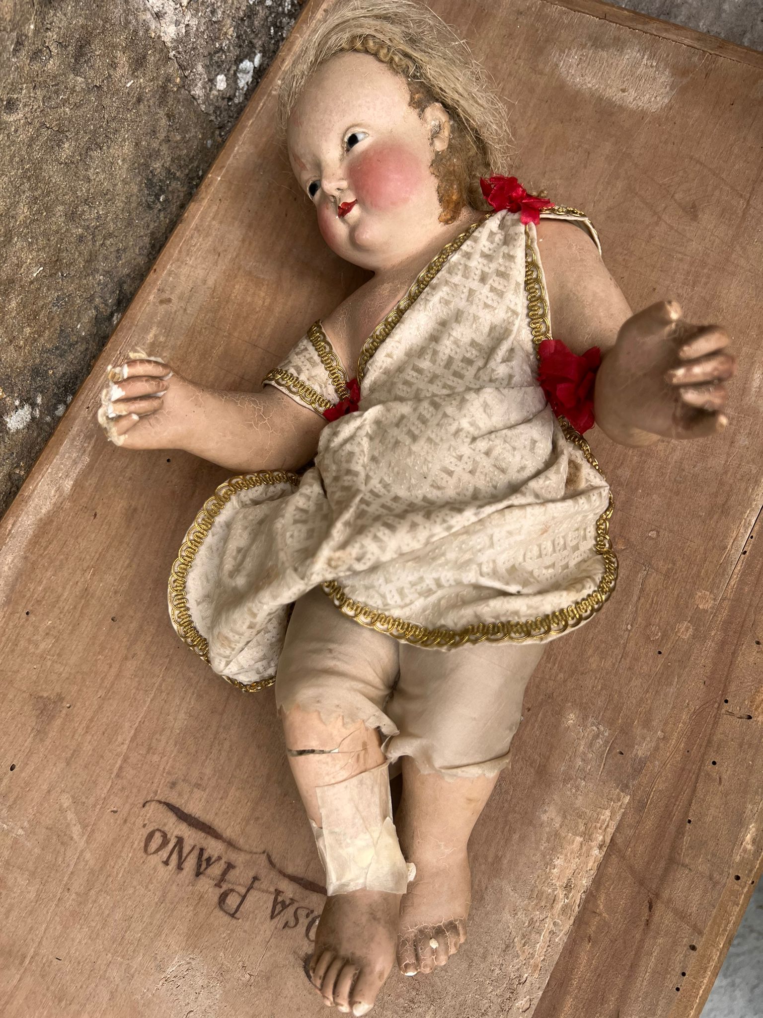 La statuetta raffigura Gesù Bambino e ci è giunta completa della cassa in legno, sul cui coperchio due scritte a penna, una sul lato esterno e una su quello interno, chiariscono i tempi e le circostanze della realizzazione dell'opera. La figura è realizzata con carta, cartone, tela e gesso (stucco di Lucca)