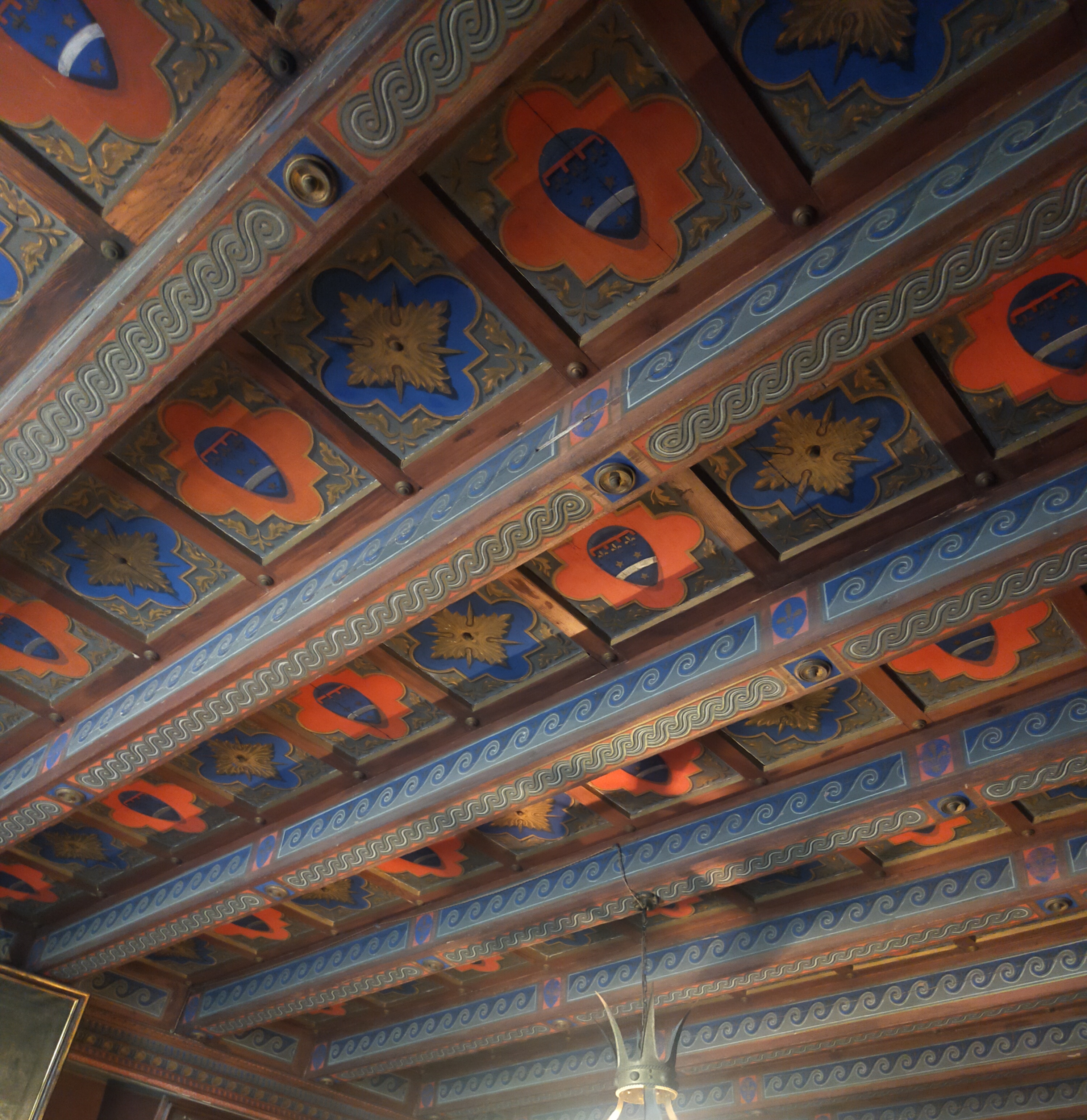 - STEMMI Dipinto sulle tavole lignee del soffitto - gentilizio - Stemma - Serristori - Azzurro, fascia d'argento, tre stelle a otto punte d'oro disposte 2, 1, lambello caricato di tre gigli d'oro
