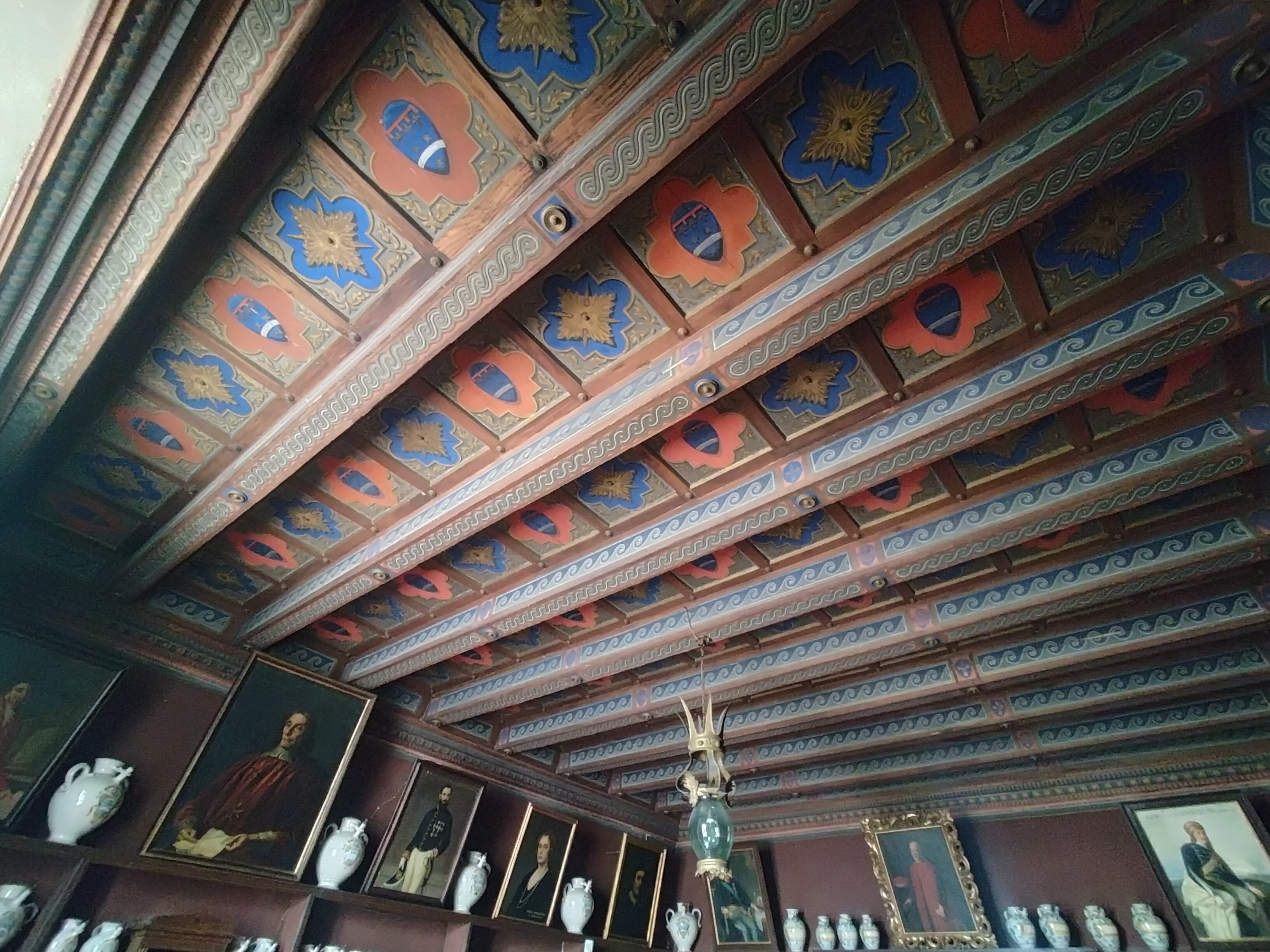- NOTIZIE STORICO CRITICHE Il termine post quem per la realizzazione del soffitto a cassettoni è sicuramente il 1890, anno in cui, per volere di Umberto Serristori, si trasferì il nosocomio presso la Villa di San Cerbone. La messa in opera del soffitto dovette avvenire negli anni immediatamente prossimi al trasferimento, o probabilmente proprio nel 1890. La scelta di una decorazione in stile neomedievale ben si combina al gusto collezionistico ed artistico di Umberto e presuppone la volontà di fornire una riambientazione ai pezzi della collezione storica di vetri e maioliche, evocando gli spazi di un’antica spezieria. La fantasiosità dei motivi ornamentali, liberamente attinti dai repertori decorativi medievali, appare in linea con il clima di revival stilistico dell'ultimo decennio dell'Ottocento