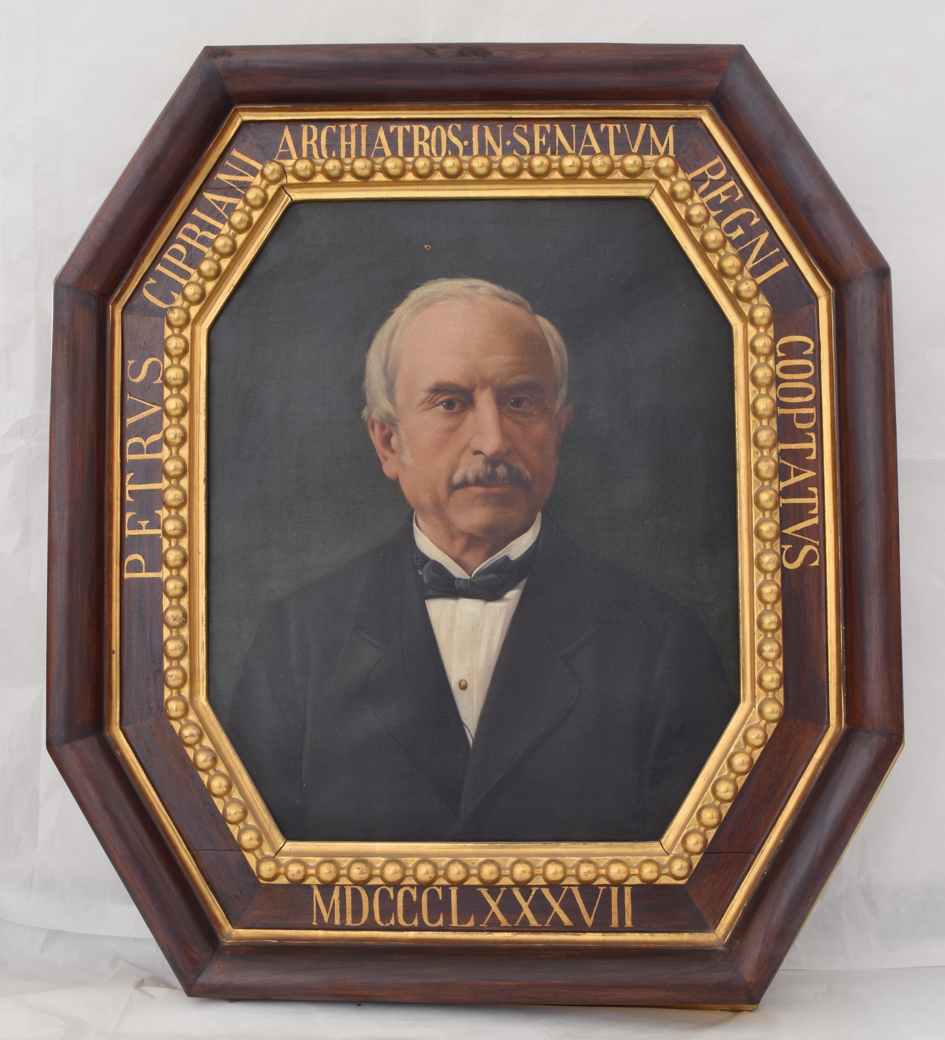 - ISCRIZIONI nella cornice - PETRVS CIPRIANI ARCHIATROS IN SENATVM REGNI COOPTATVS MDCCCLXXXVII - capitale -