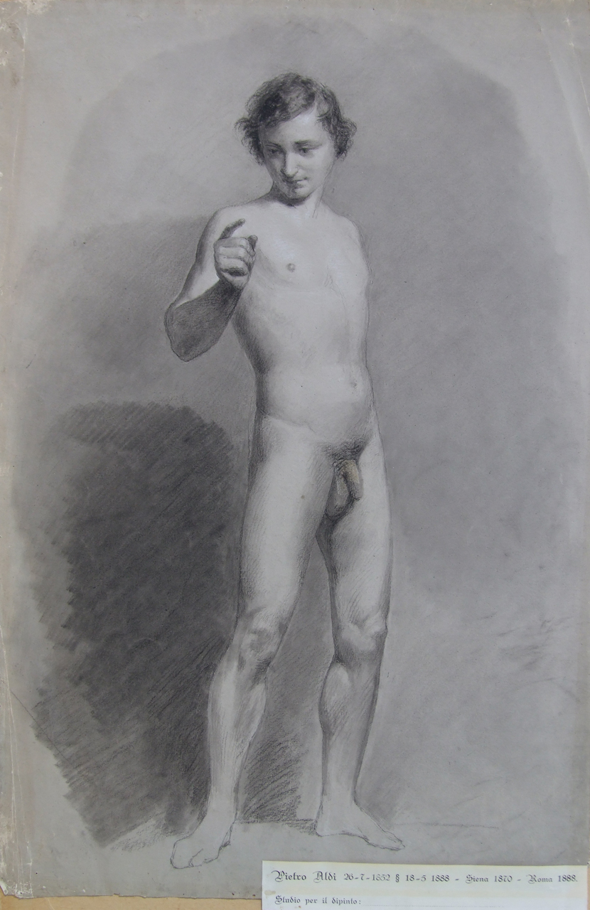 - NOTIZIE STORICO CRITICHE Il disegno è un’esercitazione scolastica di Pietro Aldi, risalente ai primi anni della sua frequentazione dell’Istituto di Belle Arti di Siena. Si tratta di un'esercitazione nella disciplina del nudo dal vero davanti al modello in posa, atteggiato in un gesto che ricorda alcune figure rinascimentali di San Giovanni Battista che predica alla folla, così da indicare un livello superiore di studio da parte dell’artista. Nel suo curriculum scolastico, il pittore è premiato all’Accademia del nudo in disegno, nel 1870 (ASSi, AIBAS, Elenco dei giovani che hanno ottenuto un premio dal 1816 al 1931, ad annum), a conclusione di un lungo esercizio, di cui questo bel disegno costituisce una importante tappa. Il tratto vi appare leggero, sfumato, luminosa la superficie della figura, fusa morbidamente nei trapassi chiaroscurali. Il rapporto compositivo tra il volto ed il gesto della mano è di grande espressività e, come accennato, fa pensare alla posa per un “San Giovanni che predica nel deserto” o per un “Gesù tra i dottori”. Divertente e curioso è l’inserimento moralistico della foglia di fico applicata a rilevo sul disegno in epoca imprecisata e tolta durante lo smontaggio