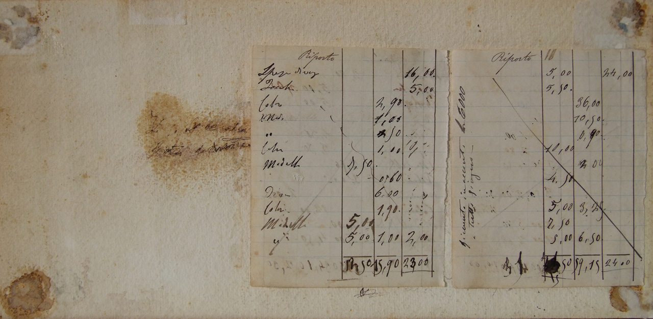 - NOTIZIE STORICO CRITICHE Il soggetto del paesaggio sembra aver interessato Pietro Aldi fino dagli esordi, come documentano i molti disegni conservati. Questo paesaggio di montagna, forse la zona amiatina, per la resa del colore è da riferire al periodo tardo della sua attività dopo il 1880 anno in cui realizza le vedute di Napoli e dintorni, con paesaggi marini di grande luminosità. Sul verso del foglio di carta sono attaccate due piccole pagine di taccuino sulle quali sono segnati ad inchiostro su quattro colonne nomi e numeri con somme