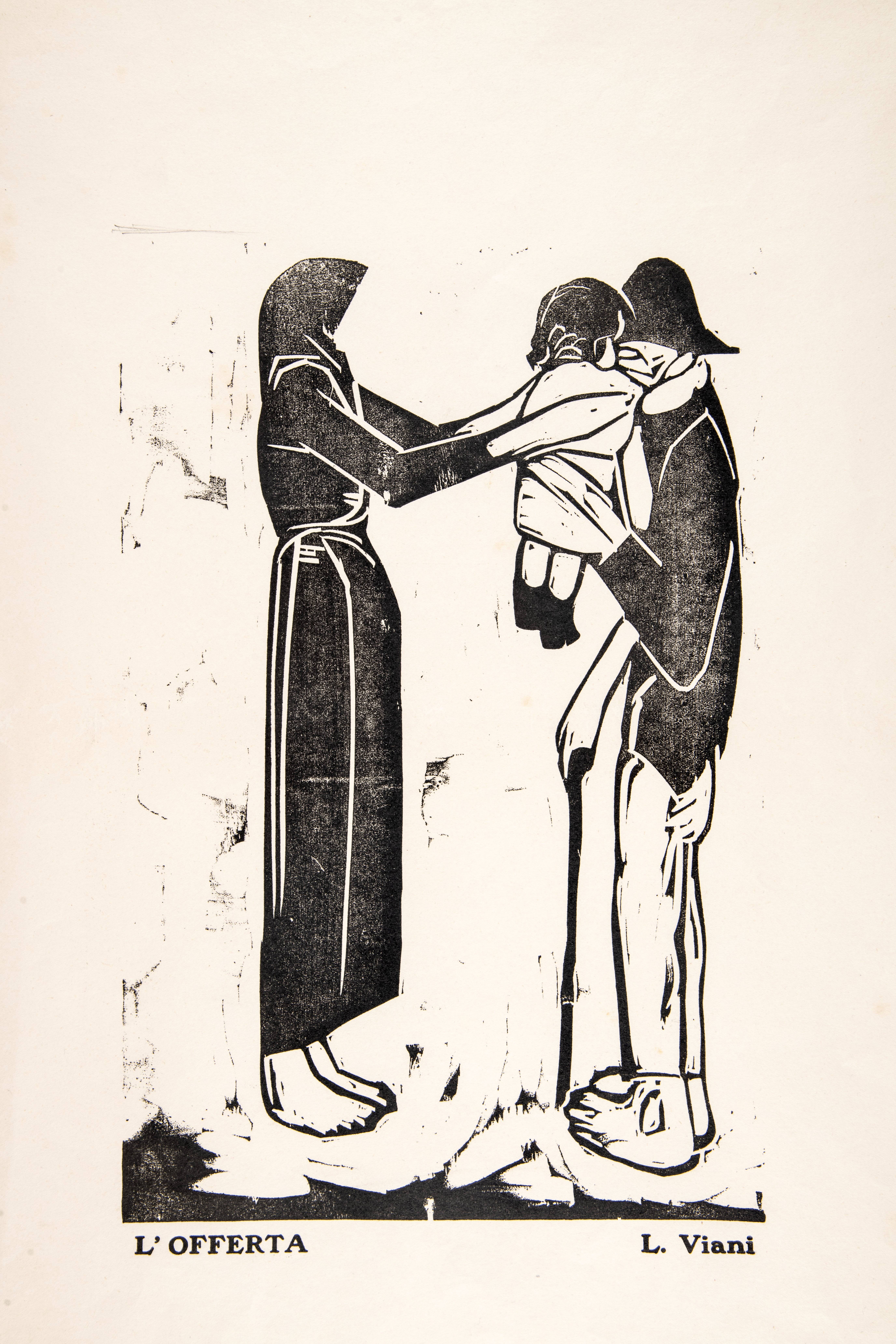 - NOTIZIE STORICO CRITICHE Undicesima xilografia del volume Il martirio rappresenta una popolana nell'atto di offrire la cosa più cara che ha: il suo bambino, ad un uomo in divisa rappresentato di fronte a lei. Questi indossa un voluminoso cappello e si appoggia ad un bastone. Il volume di stampe originali di Lorenzo Viani nella Collezione Timpanaro è intitolato Il martirio, il titolo è riportato nel frontespizio. Venne pubblicato a Viareggio nel 1915, anno della guerra, come nota l'artista nella xilografia della copertina posteriore che reca anche le indicazioni editoriali. Le xilografie che compongono il volume, che viani definisce "originali e dirette", hanno come tema le sciagure dei morti del mare e delle loro famiglie, certamente molto sentito da un uomo nato in Darsena. Le motivazioni del soggetto e dello stile sono spiegate da Viani nella metà sinistra del primo foglio, in cui è riportata la nota a caratteri tipografici: "Questa raccolta di xilografie è tratta dagli studi di un mio quadro La Benedizione dei morti del mare, che sto ultimando per la casa comunale del mio paese. Chi conosce da vicino l’ordine e la disciplina del mio lavoro, non si meraviglierà se queste tavole sono di una sintesi che un mio amico ha definito disperata! Il concetto che ha informato il mio lavoro mi ha portato a questa sommarietà di espressione che voglio sviluppare fino a che non sono giunto alla linea pura. Siccome penso che l’arte sia fenomeno di volontà, ho dato a quest’opera quello speciale carattere primitivo, nella disposizione dei gruppi, per rendere il concetto più vasto: universale! Così ho potuto armonizzare nella Benedizione dei morti del mare, le figure che qui appaiono in tavole frammentarie. Il naufrago, La cattiva notizia, Il vicinato, Il superstite, L’attesa, L’offerta, La preghiera. Scene tra loro lontane nel tempo che dicono tutti gli stati d’animo di questa gente". Da notare è il fatto che il Viani nella copertina anteriore che fa da frontespizio scrisse: “Raccolta di XII xilografie originali e dirette”, tuttavia nella prefazione citò solo sette titoli.Tutte le xilografie sono caratterizzate da una linea pura e cruda e contrasti netti di bianco e nero che caratterizzano l'intera produzione xilografica dell'artista. Il volume fu stampato in sole 1000 copie dalla Tipografia Ciani di Viareggio