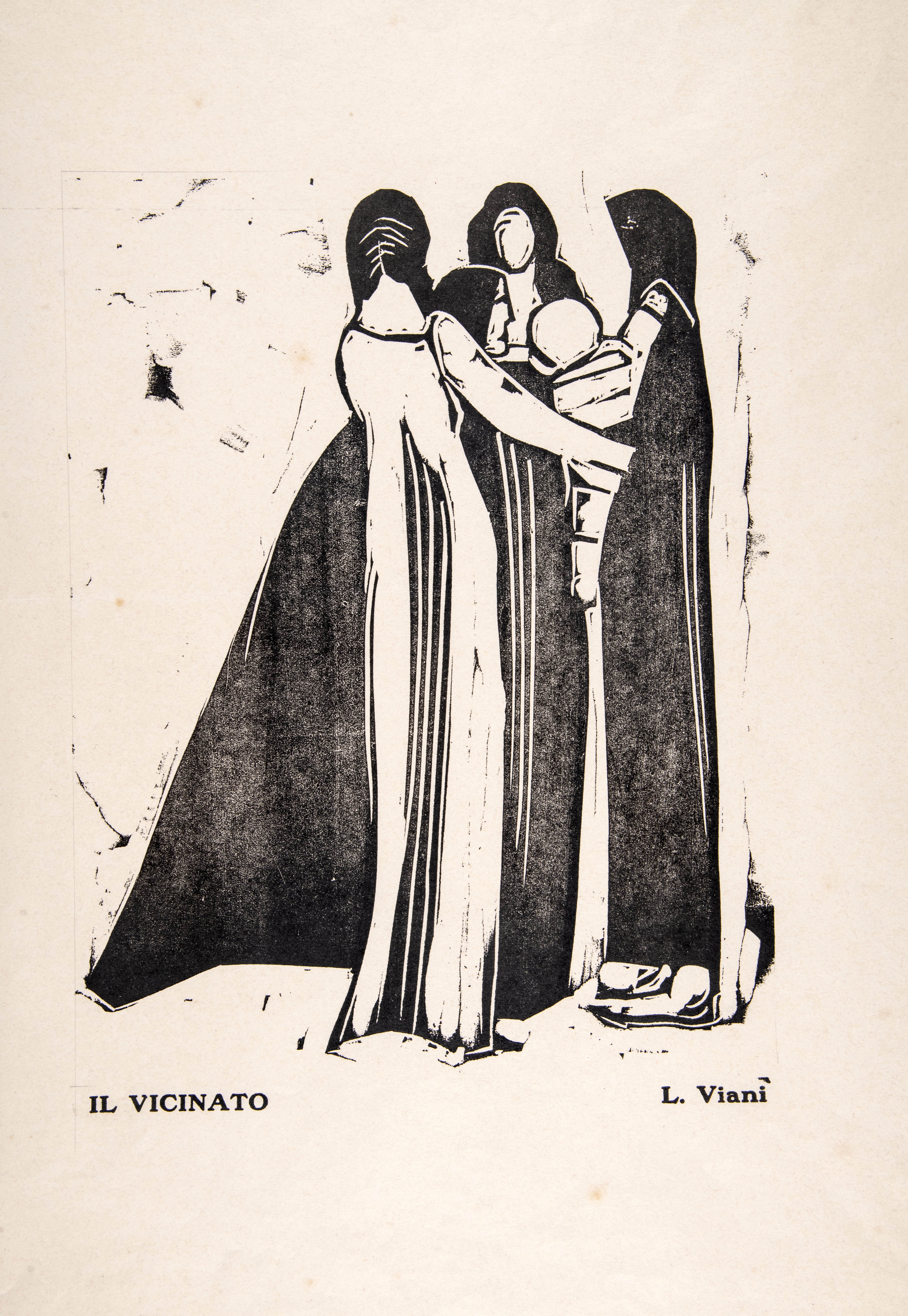 - NOTIZIE STORICO CRITICHE Xilografia intitolata Il vicinato (è la quarta xilografia del volume ll martirio) rappresenta un gruppo di quattro donne disposte in cerchio intente a dialogare. La donna sulla destra ha in braccio un bambino e la donna sulla sinistra è protesa verso di lei. È rappresentata una dimensione di protezione tutta femminile intorno ad un neonato già destinato ad un’esistenza tormentata. Anche in questo caso Viani non fa nessuna concessione al dato atmosferico, le figure sono tutte disposte in primo piano e con pochi segni e forti contrasti di bianco-nero riesce a rendere l’intensità del dialogo fra le quattro figure. Il volume di stampe originali di Lorenzo Viani nella Collezione Timpanaro è intitolato Il martirio, il titolo è riportato nel frontespizio. Venne pubblicato a Viareggio nel 1915, anno della guerra, come nota l'artista nella xilografia della copertina posteriore che reca anche le indicazioni editoriali. Le xilografie che compongono il volume, che viani definisce "originali e dirette", hanno come tema le sciagure dei morti del mare e delle loro famiglie, certamente molto sentito da un uomo nato in Darsena. Le motivazioni del soggetto e dello stile sono spiegate da Viani nella metà sinistra del primo foglio, in cui è riportata la nota a caratteri tipografici: "Questa raccolta di xilografie è tratta dagli studi di un mio quadro La Benedizione dei morti del mare, che sto ultimando per la casa comunale del mio paese. Chi conosce da vicino l’ordine e la disciplina del mio lavoro, non si meraviglierà se queste tavole sono di una sintesi che un mio amico ha definito disperata! Il concetto che ha informato il mio lavoro mi ha portato a questa sommarietà di espressione che voglio sviluppare fino a che non sono giunto alla linea pura. Siccome penso che l’arte sia fenomeno di volontà, ho dato a quest’opera quello speciale carattere primitivo, nella disposizione dei gruppi, per rendere il concetto più vasto: universale! Così ho potuto armonizzare nella Benedizione dei morti del mare, le figure che qui appaiono in tavole frammentarie. Il naufrago, La cattiva notizia, Il vicinato, Il superstite, L’attesa, L’offerta, La preghiera. Scene tra loro lontane nel tempo che dicono tutti gli stati d’animo di questa gente". Da notare è il fatto che il Viani nella copertina anteriore che fa da frontespizio scrisse: “Raccolta di XII xilografie originali e dirette”, tuttavia nella prefazione citò solo sette titoli.Tutte le xilografie sono caratterizzate da una linea pura e cruda e contrasti netti di bianco e nero che caratterizzano l'intera produzione xilografica dell'artista. Il volume fu stampato in sole 1000 copie dalla Tipografia Ciani di Viareggio