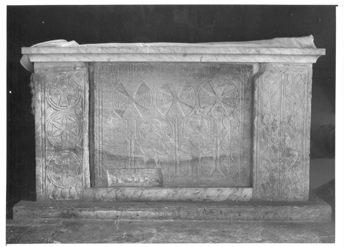 L'altare, composto con elementi marmorei della chiesa alto-medievale, comprende due lastre rettangolari e quattro pilastrini decorati da figure stilizzate e motivi di ornato eseguiti a incavo e a graffito
