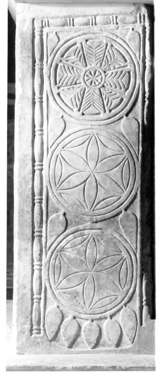 - NOTIZIE STORICO CRITICHE Riguardo agli elementi utilizzati nel pilastrino in questione, J. Serra (1961) nota la grande diffusione, in tempi e luoghi diversi, del motivo della rosetta geometrica esagonale, la cui origine risulta molto antica, e il fatto che la foglie lanceolate che pendono dai tre cerchi e dalla cornice del lato superiore sono identiche a quelle che compaiono nelle due lastre maggiori e nel pilastrino attualmente adoperato sul lato frontale dell'altare, nella parte destra. Da notare la disposizione simmetrica degli elementi che costituiscono la decorazione rispetto a un ideale asse verticale che passi per il centro della figurazione