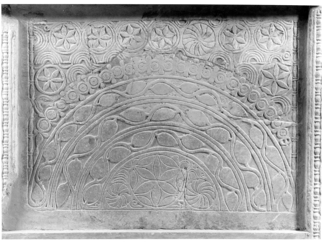 Lastra rettangolare ornata da fasce semicircolari concentriche con tralci di foglie ondulati, che si dispongono intorno a un semicerchio contenente una rosetta esalobata inscritta in un esagono inflesso e due tondi simmetrici con rosette a eliche. La rimanente superficie è occupata da rosette esalobate entro tondi e archetti ripassati. Cornice a fuserole