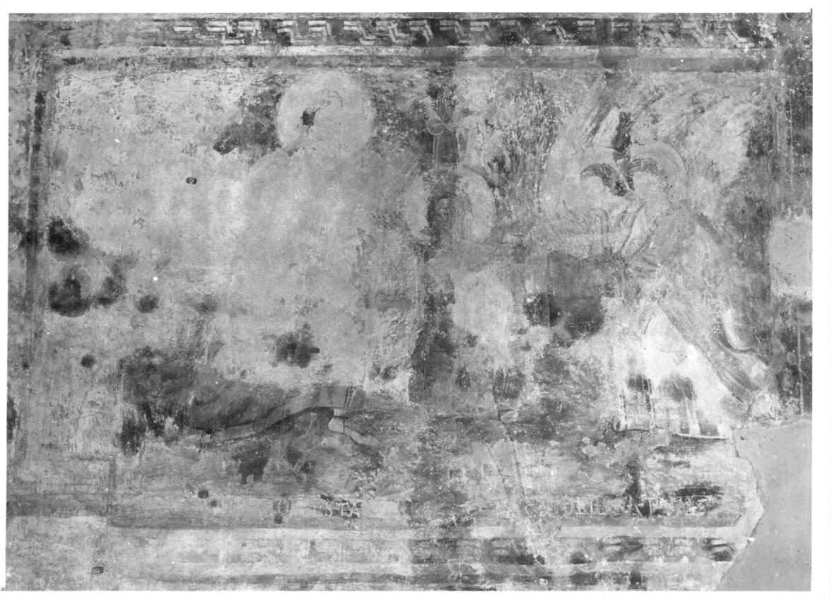 - NOTIZIE STORICO CRITICHE L'autore di questa scena sarebbe, secondo Borsellino (1974), quello degli autori del ciclo che egli chiama, dal soggetto della prima scena della parete sinistra, "Maestro della Creazione". Monumentalità, colori tenui, calma compositiva, impiego di fondi azzurri, tendenza a disporre le figure in modo rigorosamente simmetrico o, se singole, al centro del campo pittorico sono le principali caratteristiche distintive dello stile di questo maestro. La figura di Cristo ha incarnati rosa con massimi chiari lumeggiati in bianco e massimi scuri in rosso-bruno. Per quanto gli incarnati dei volti degli angeli siano giunti allo stato di frammenti, è stato possibile riconoscerne la tecnica di esecuzione, che si avvale dell'uso del verdaccio