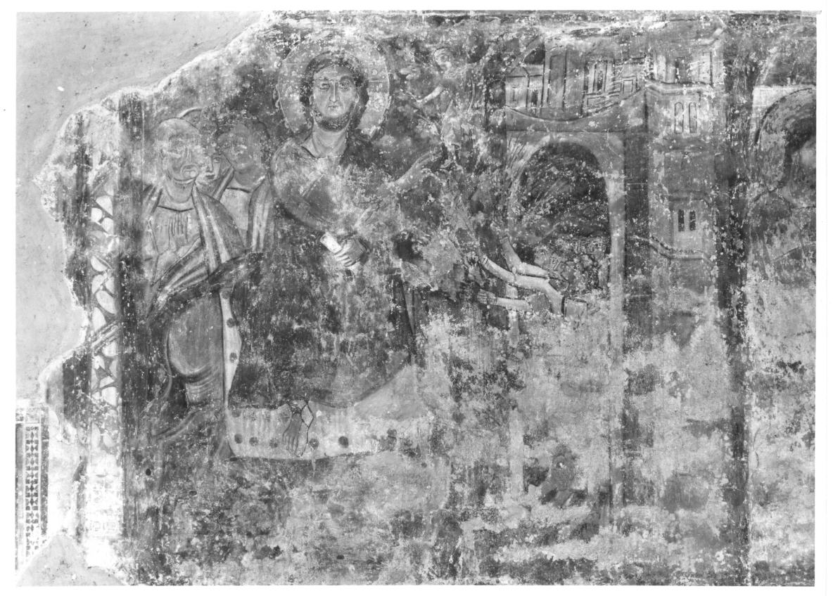 Personaggi: Cristo; Apostoli. Attributi: (Cristo) rotulo. Animali: asino. Oggetti: gualdrappa. Figure: figure festanti; fanciullo. Attributi: (figure festanti) rami di palma. Piante: albero. Vedute: Gerusalemme