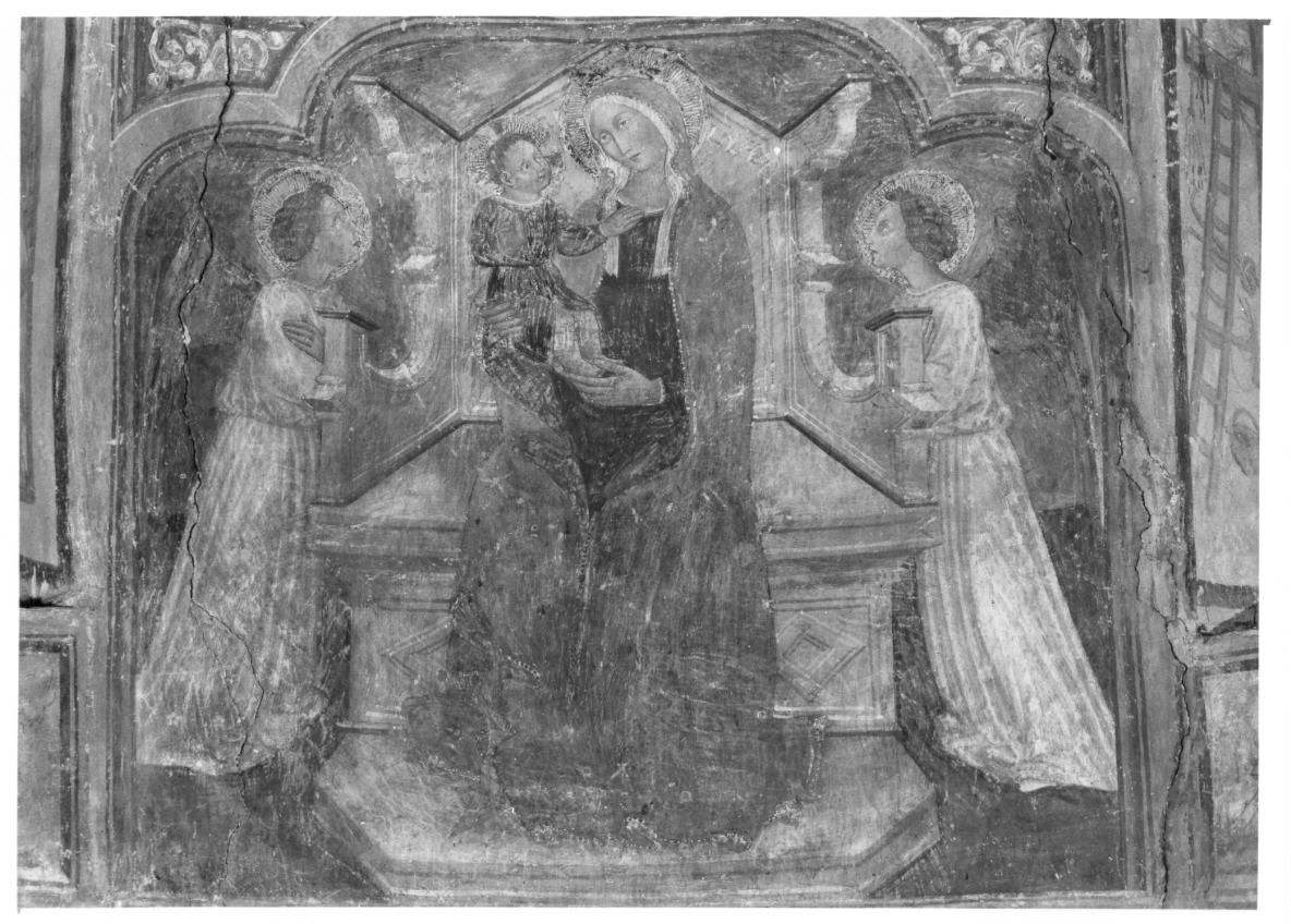 Personaggi: Madonna; Bambino. Figure: angeli. Oggetti: trono. Decorazioni: cornice trilobata