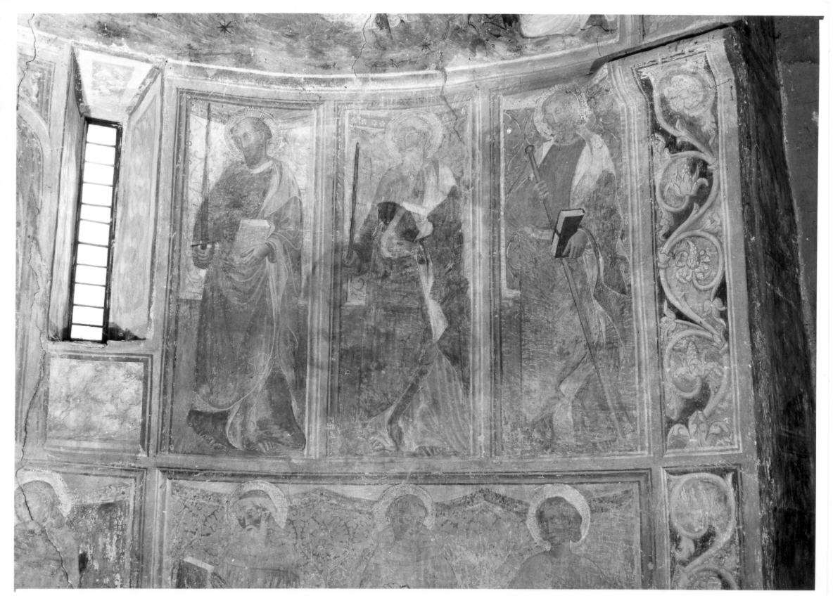 Personaggi: S. Paolo; S. Matteo (?); S. Giacomo Maggiore. Attributi: (S. Paolo) libro; spada; (S. Matteo) libro; alabarda (?); (S. Giacomo Maggiore) libro; bastone da pellegrino. Oggetti: cortina damascata