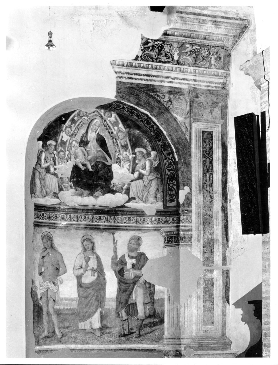 Entro un'inquadratura classicheggiante con colonne scanalate dipinte e cornici grottesche, nella parte superiore Vergine col Bambino in una mandorla con cherubini e ai lati due angeli adoranti. Nella parte inferiore, su uno sfondo di un paesaggio tipicamente umbro, i tre Santi Sebastiano, Giovanni Evangelista e Rocco, ognuno con gli attributi tradizionali