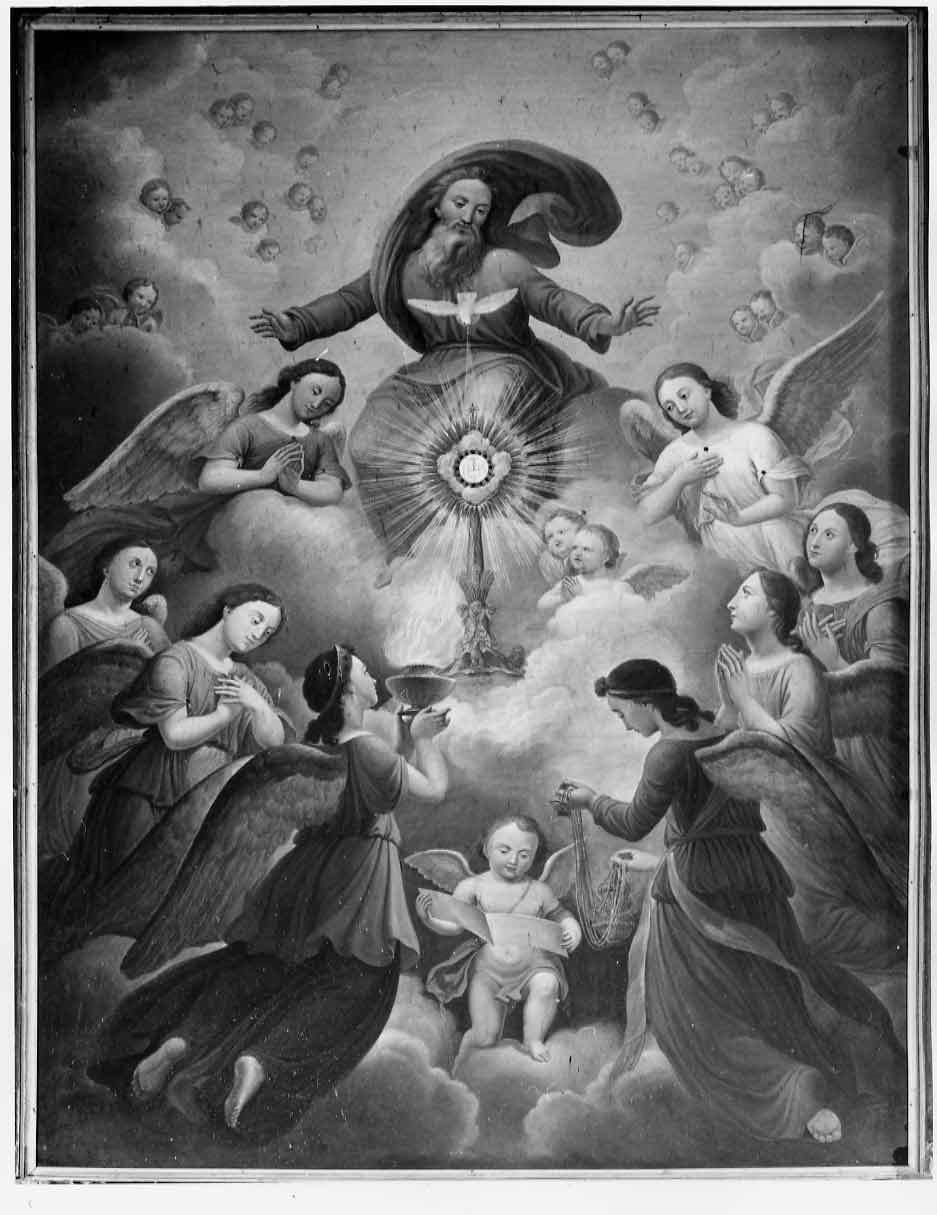 Al centro del dipinto, ostensorio raggiato con monogramma costantiniano. S opra di esso, la colomba dello Spirito Santo, con sullo sfondo, la figura di Dio barbato. Intorno all'ostensorio sono, oltre ad una coppia di cherub ini ed un putto alato, sei angeli oranti e due che offrono incenso ed una lampada accesa