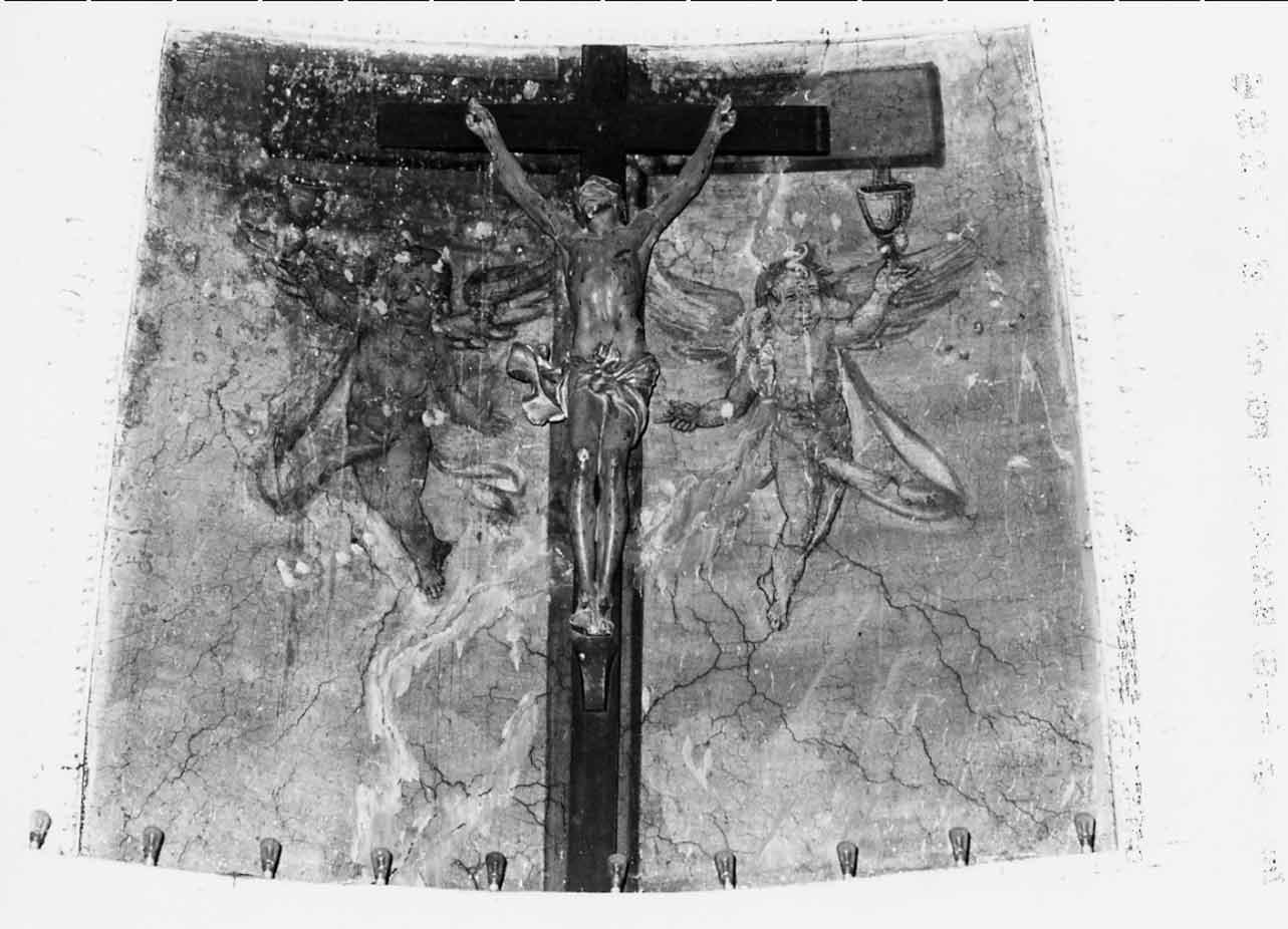 - NOTIZIE STORICO CRITICHE L'affresco di scarsa qualità artistiche fa parte del ciclo absidale incent rato sul tema del "Giudizio Universale". Opera di carattere popolaresco e di ambito artigianale locale, è databile alla fine del sec. XVI, periodo i n cui appartengono anche gli stucchi in cui questi affreschi sono inseriti . Sotto la croce di legno ve ne era già una dipinta, tuttora visibile. Que lla attuale è certamente più tarda e già ascrivibile al gusto settecentesc o per la linea sinuosa, come appare nel perizoma del Cristo