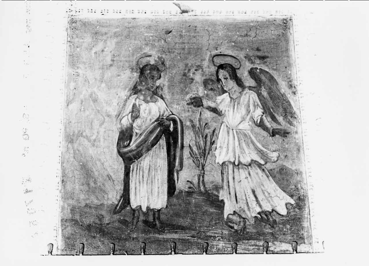 Sullo sfondo di un paesaggio naturale, la Vergine stante, con tunica bianc a e panneggio rosso, riceve l'annuncio dell'angelo anch'egli vestito di bi anco alato. Tra le due figure si vede un alberello sul fondo