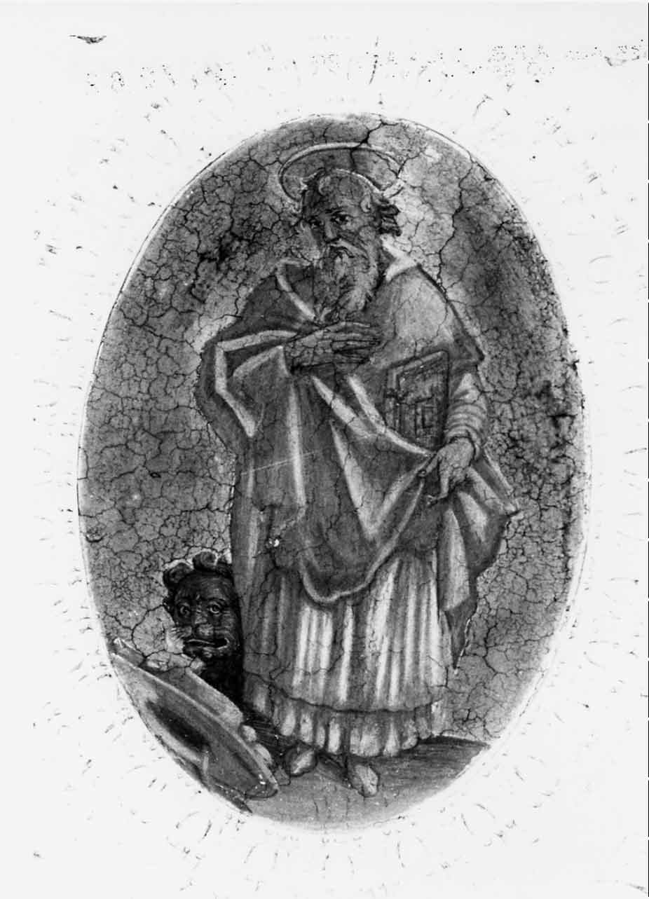 - NOTIZIE STORICO CRITICHE L'affresco appartiene al ciclo absidale raffigurante i "Quattro dottori de lla Chiesa". Di valore culturale più che artistico, anche quest'opera è ri feribile allo stesso autore del ciclo col "Giudizio Universale" sempre nel la volta della stessa chiesa