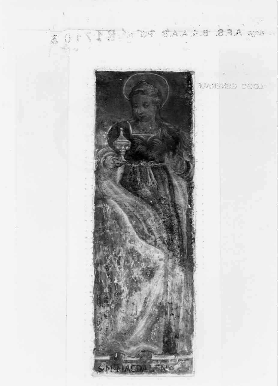La santa, con aureola, veste scura e manto rosso, tiene nella destra un tu ribolo dell'incenso