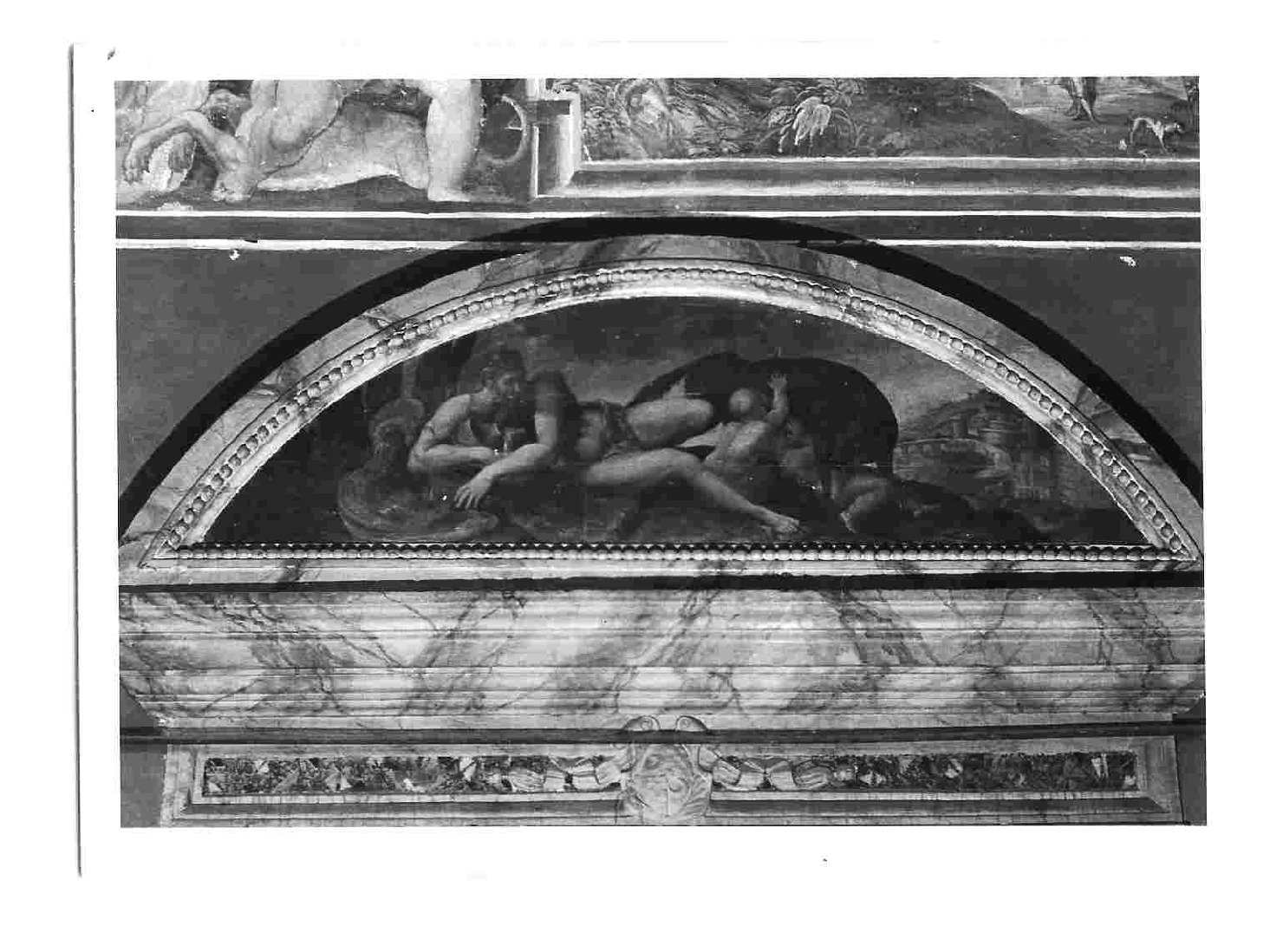 - NOTIZIE STORICO CRITICHE Le lunette affrescate, che si trovano solamente in questa sala, hanno un v alore puramente ornamentale. Lo stucco in rilievo della lunetta completa l 'archittetura della porta e subordina la decorazione affescata. Le lunette presentano un unico schema compositivo: in primo piano una figura allegor ica di fiiume e sullo sfondo un paesaggio quasi irreale. Si può pensare ch e questa lunetta rappresenti l'allegoria delle origini di Roma dalla presn za della lupa con i due gemelli e dall'allegoria del Tevere