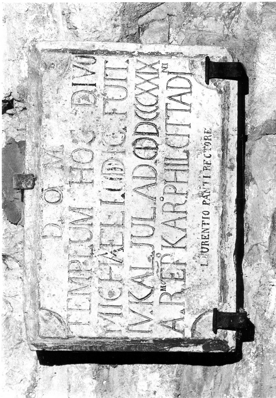 - ISCRIZIONI su tutta la superficie - D(EO) O(PTIMO) M(AXIMO)/ TEMPLUM HOC DIVO/ MICHAELI DIC(A)TUM FUIT/ IV KAL(ENDAS) JUL(II) A(NNO) D(OMINI) MDCCCXXIX A R(EVERENDISSI)MO EP(ISCOPO) KAR(OL)O PHIL(ESIO) CITTADINI/ LAURENTIO PANTI RECTORE - lettere capitali -