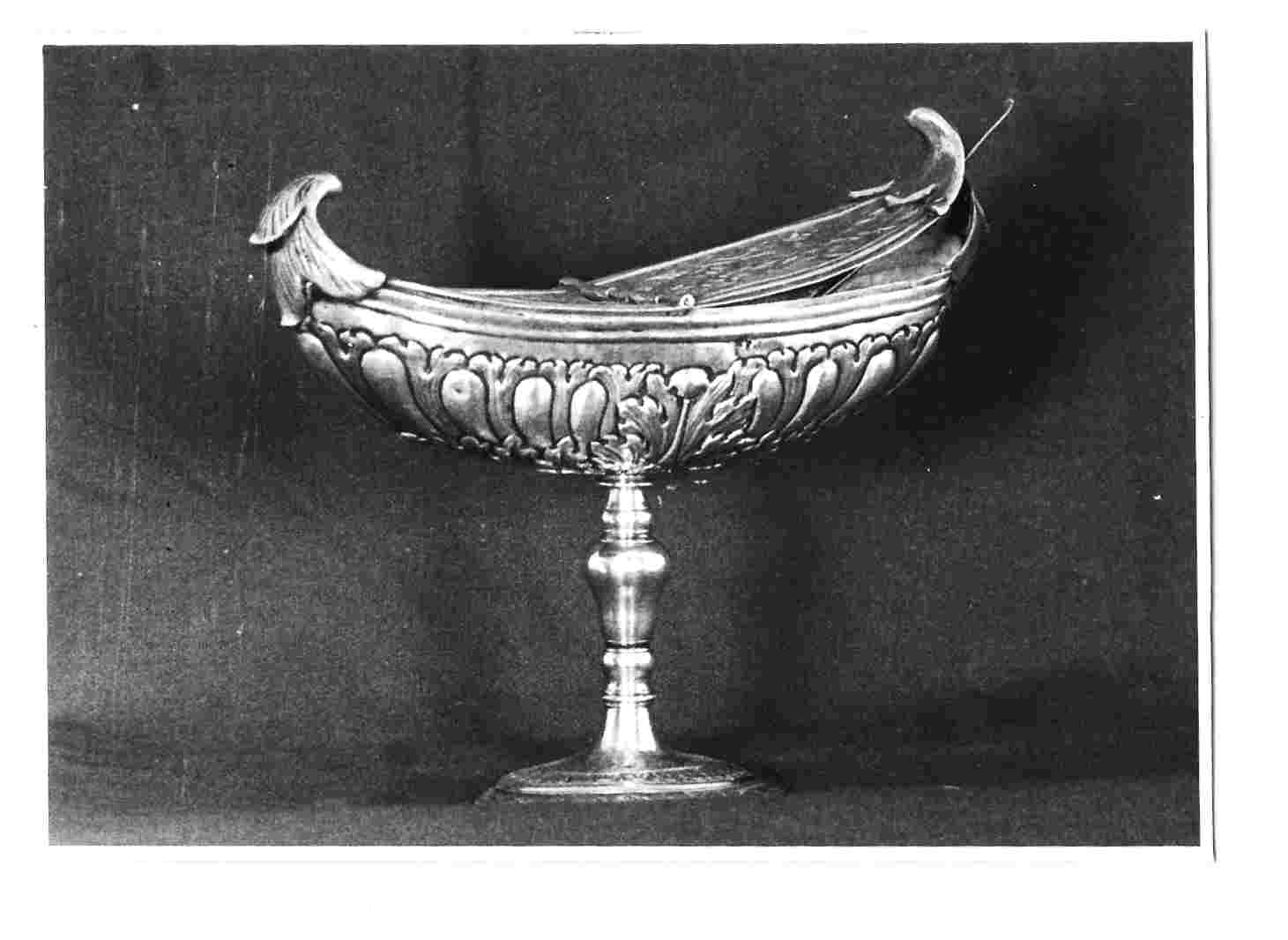 La navetta a forma di mezzaluna con coperchio, edcorata a sbalzo con motiv i vegtali, ha il fusto con nodo piriforme e poggia su una base circolare c esellata. Su un lato è preasente il punzone dell'argentiere