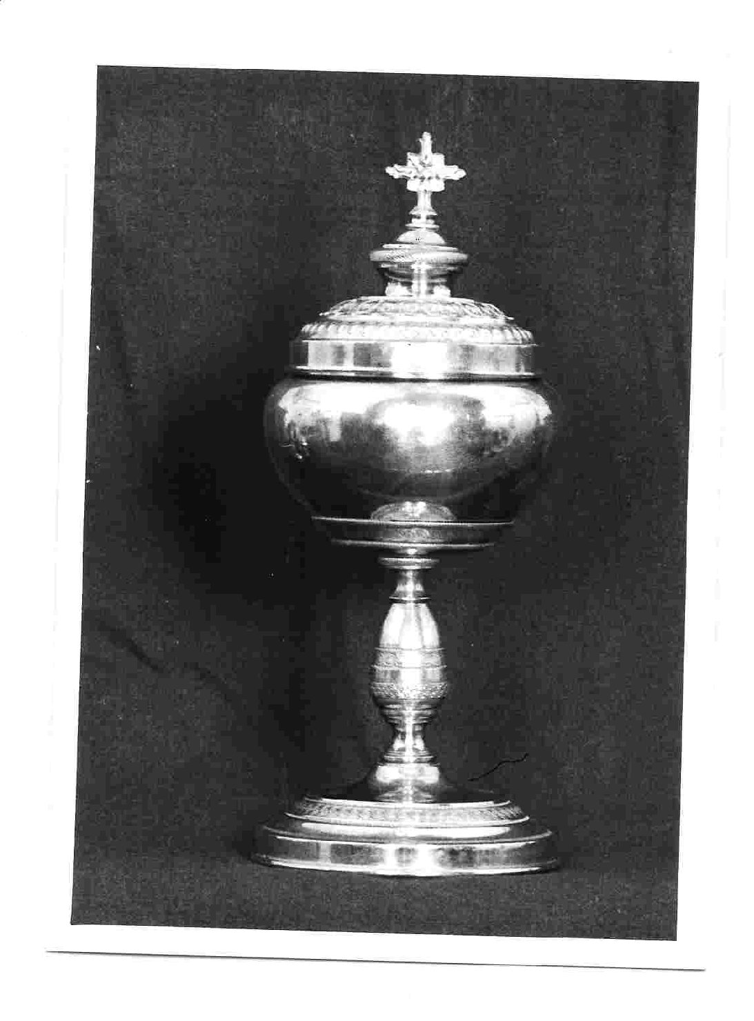 - NOTIZIE STORICO CRITICHE Gli accassori liturgici della Chiesa hanno avuto sicuramente un incremento in seguito della fondazione della Confraternita del Buon Consiglio e Mort e sorta nel 1755( cfr. G. Resini 1974, p. 7); ciò in parte ne spiega l'ing ente quantità tutt'oggi esistente. Il caratterer strettamente funzionale d i questi arredi liturgici presenta, fin dalle origini, elementi tipologici quasi costanti in quanto le botteghe di oreficeria e di argenteria spess o si adeguavano a questa tradizione artigianale. L'opera in oggetto per la semplicità stilistica e per l'analogia strutturale con il calice si può c ollocare nella produzione artigianale di arredi liturgici del secolo XVIII