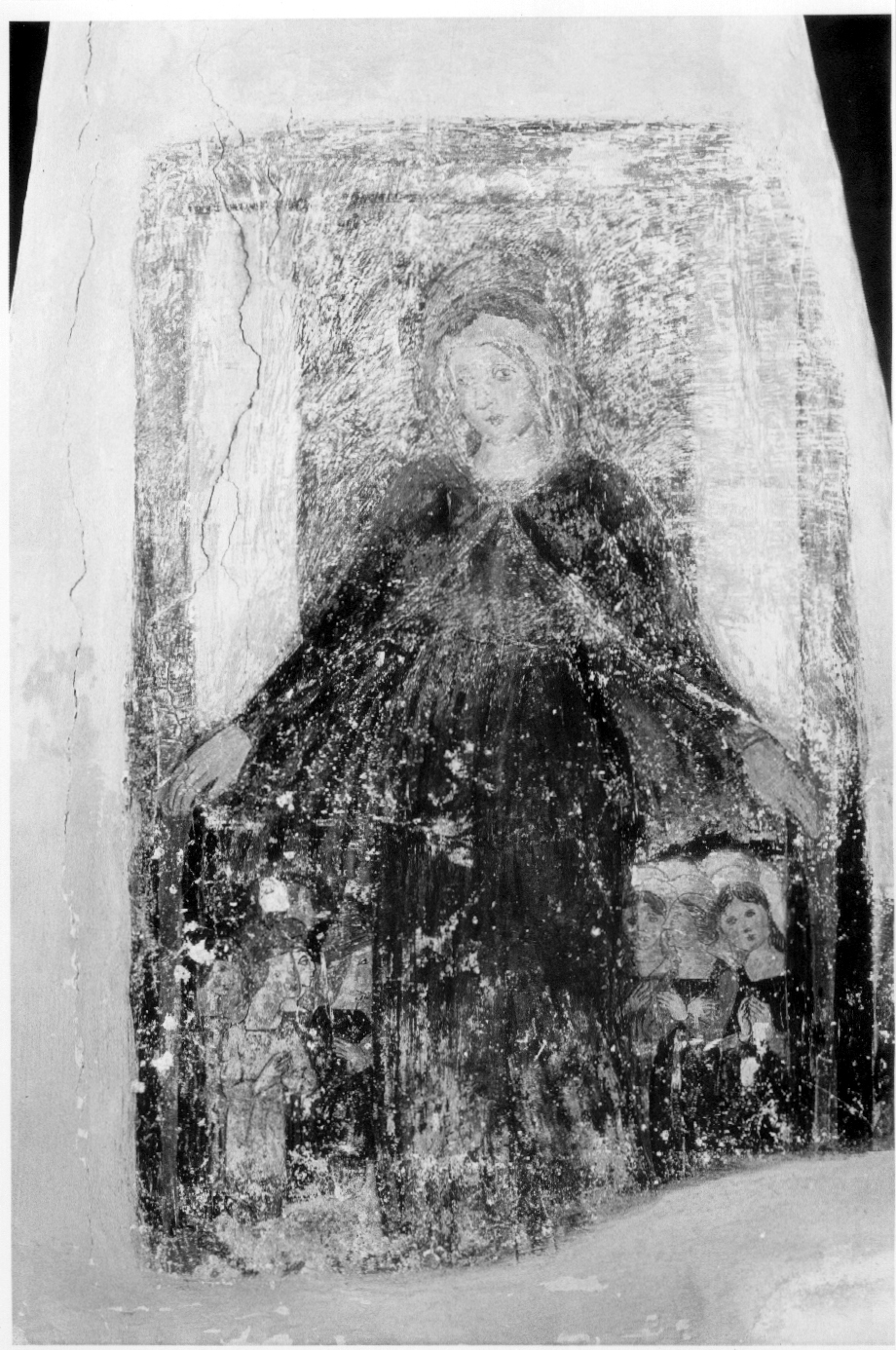 La Vergine protegge con il suo ampio manto due gruppi di persone: a sinistra gli uomini e a destra le donne