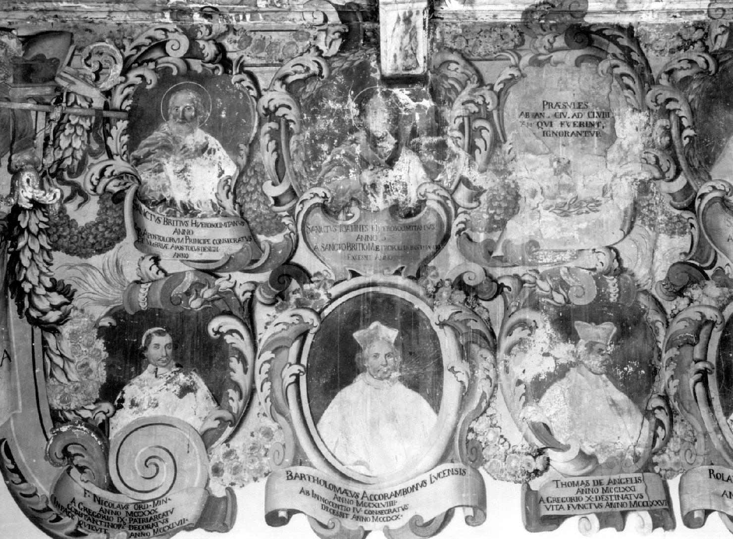- NOTIZIE STORICO CRITICHE I dipinti fanno parte di una lunga serie di ritratti di vescovi spoletini che ornano le pareti della sala. Inizia con il primo, San Brizio, e termina con i vescovi della prima metà del novecento. Nella fascia superiore sono raffigurati i vescovi che ressero la diocesi fino alla fine del secolo XII, in quella inferiore i succeossori fino a Mons.Lascaris, eletto nel 1711. In una terza fascia infine in ovali ad olio su tela sono raffigurati i Vescovi seguenti fino al XX secolo. In dimensioni maggiori rispetto agli altri sono raffigurati Maffeo Barberini, sulla parete ovest, e Giovanni Maria Mastai Ferretti entrambi vescovi di Spoleto e più tardi divenuti papi col nome rispettivamente di Urbano VIII e di Pio IX. La decorazione della sala fu cominciata sotto il vescovato di Mons. Lorenzo Castrucci (1617-1655) e poi proseguita e rimaneggiata sotto il vescovo Carlo Giacinto Lascaris (1711-1729), e continuata quindi dai suoi successori. I dipinti, di modesta qualità, rispecchiano nella condotta pittorica e nei motivi decorativi i vari periodi cronologici di pertinenza, uniformandosi però nelle dimensioni e rispettando la disposizione iniziale dei ritratti