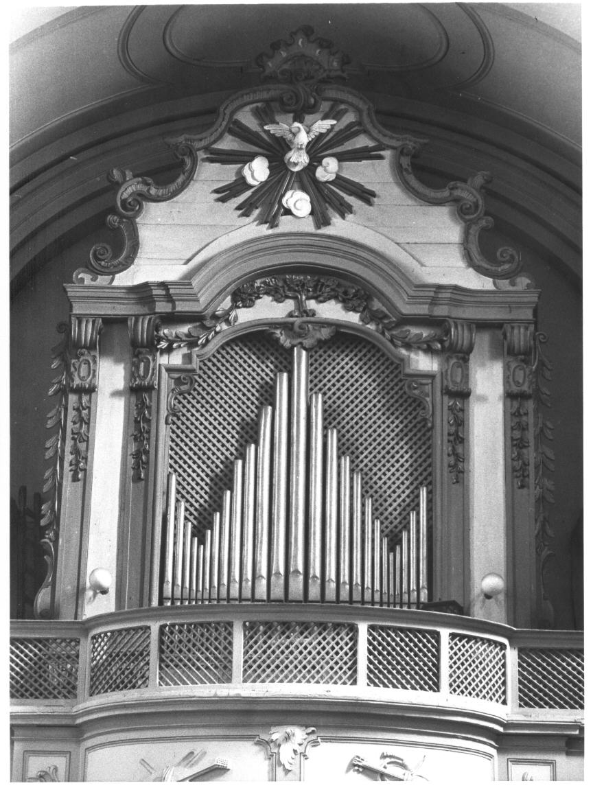 Consolle con due tastiere e pedaliera; canne cilindriche in metallo. La cassa presenta un'unica apertura, al di sopra della quale è un motivo decorativo costituito da un piccolo albero da cui si dipartono festoni di foglie; due coppie di paraste ornate da cartigli e festoni a rilievo sorreggono la trabeazione mistilinea; il timpano a volute è ornato da raggiera con colomba