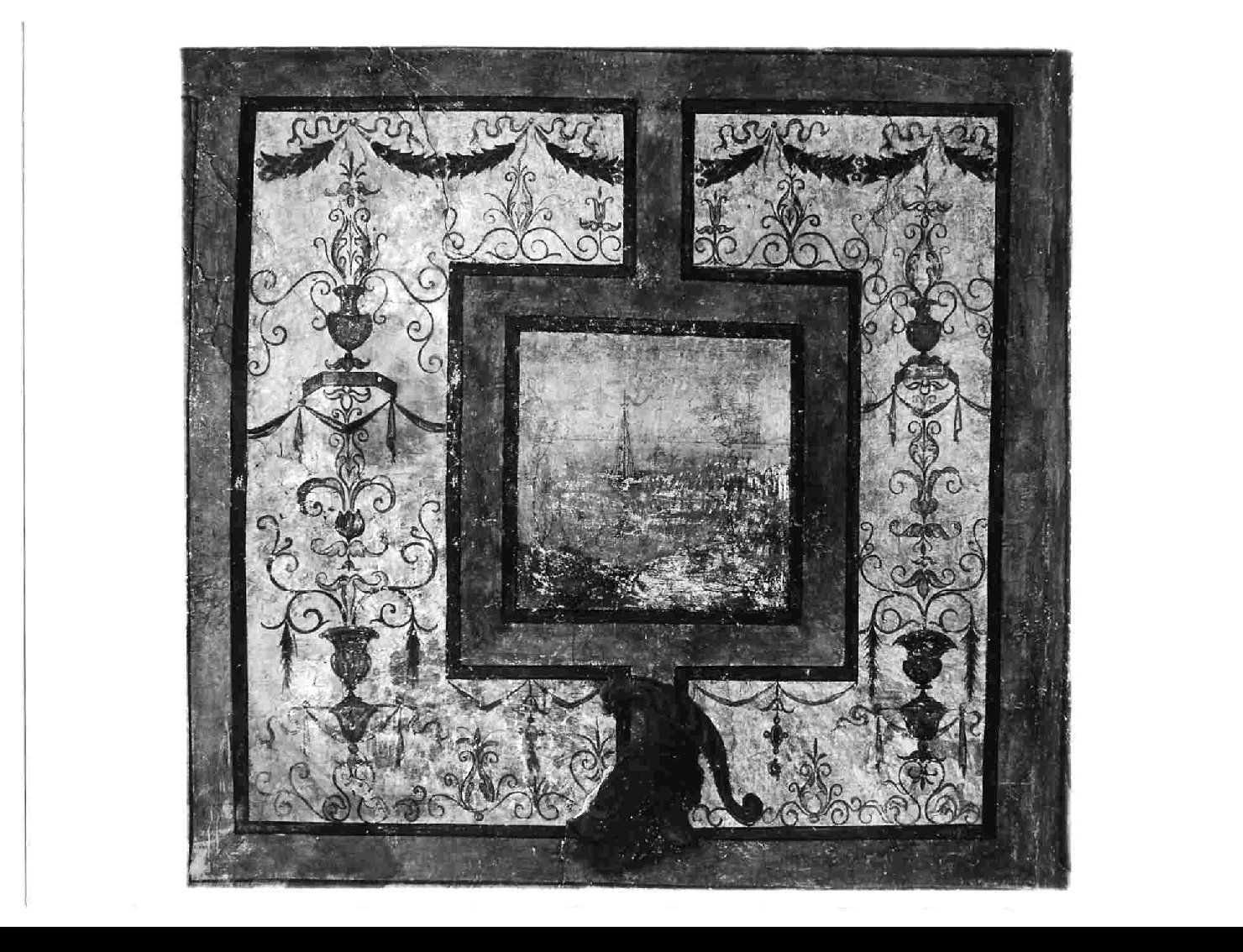 Decorazioni: grottesche; fascia geometrica; elmo piumato. Paesaggi: specchio d'acqua; barca; sponda; alberelli