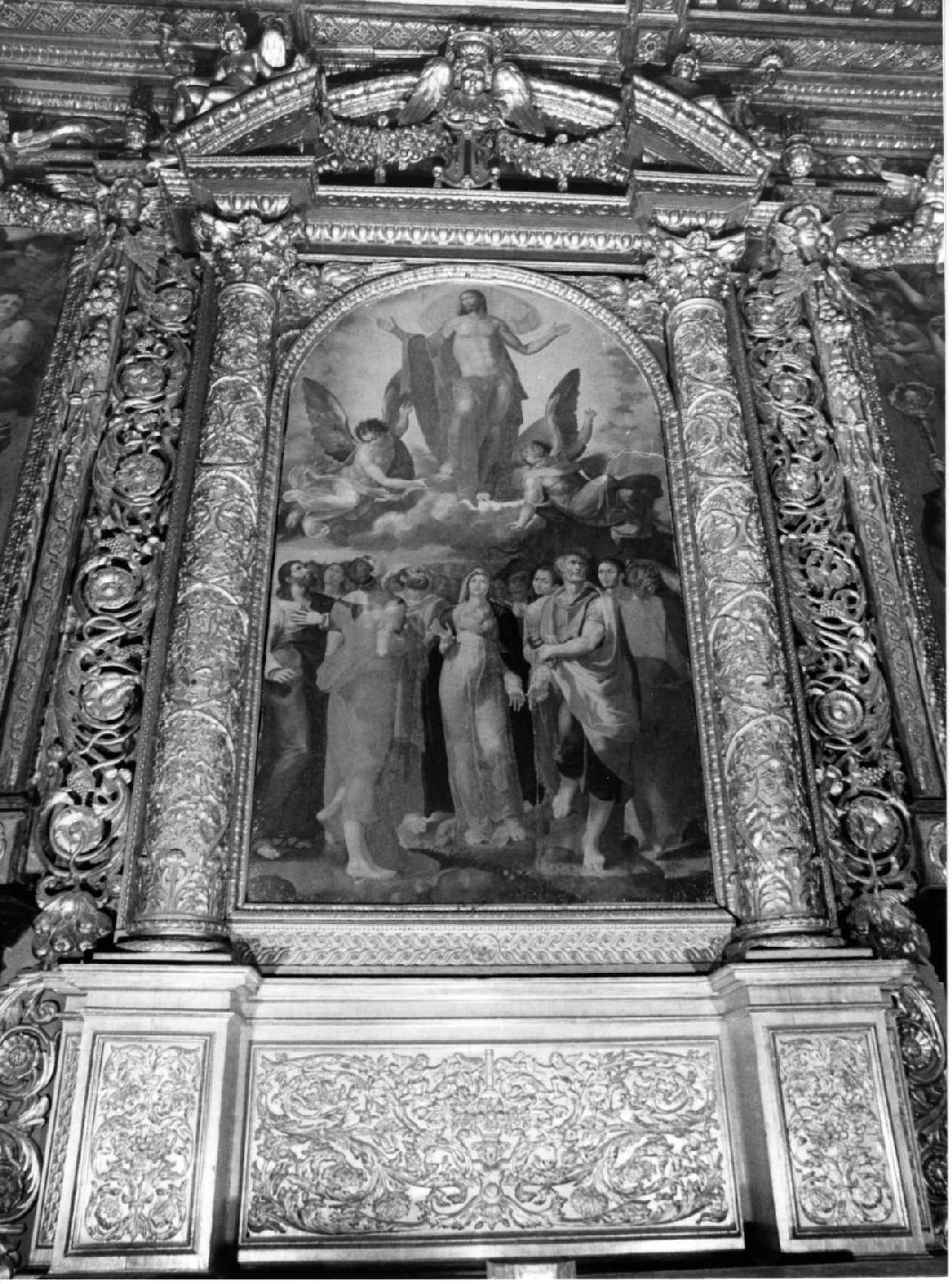 Mostra d'altare con specchiature alla base decorate con motivi vegetali, c olonnine decorate a spirali vegetali, frontone a timpano spezzato con al c entro cherubino con le ali