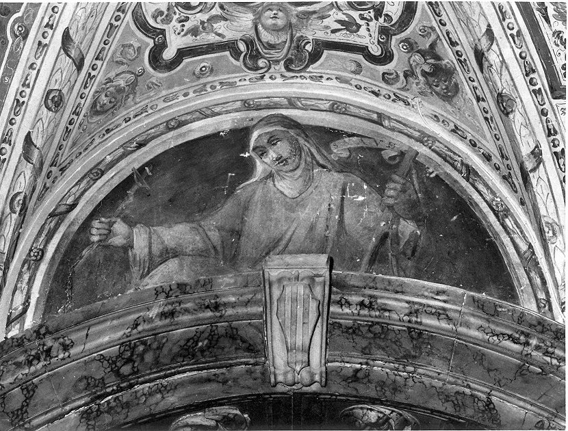 All'interno della lunetta è raffigurata ad affresco una figura femminile a mezzo busto in abiti monastici che sostiene con la mano destra un crocifisso, con la sinistra un bastone