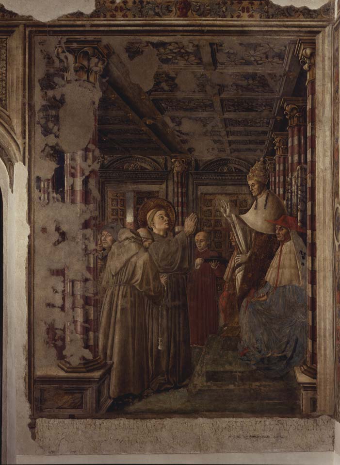 - NOTIZIE STORICO CRITICHE In questa scena Bonfigli dimostra quanto sia ancora forte il legame stilistico con l'Angelico, le cui opere aveva conosciuto durante il soggiorno romano. "La serena solennità angelichiana torna immutata nella scena del Bonfigli, che ripropone un analogo schema compositivo, nel tentativo di ricreare, nel più rappresentativo luogo di Perugia, l'atmosfera di Umanesimo cristiano perseguita a Roma da Niccolò V, intento alla rifondazione ecclesiale ed urbana della città, così come il governo perugino si era prefissato, proprio con la decorazione della cappella dei Priori di ribadire i suoi legami morali, religiosi e politici con il santo francese". Oltre all'Angelico viene richiamato un altro grande maestro del Bonfigli, Domenico Veneziano, ricordato nelle finezze luministiche e nella raffinatissima tecnica esecutiva. L'affresco, il primo di tutto il ciclo, venne eseguito con grande attenzione forse perché doveva rappresentare una sorta di presentazione ai suoi committenti. (Mencarelli, 1996, pp.74-77). L’organizzazione spaziale di questa prima scena rimanda alla Consacrazione di san Lorenzo dipinta da Beato Angelico nella cappella Niccolina a Roma tra il 1448 e il 1450 e il San Giacomo di fronte ad Erode, affrescato dal Mantegna nella cappella Ovetari a Padova tra il 1448 e il 1457, mentre l’attenzione per la resa della luce e le raffinatezze cromatiche rendono omaggio a Domenico Veneziano e alla produzione fiamminga, conosciuta forse a Roma durante l’anno giubilare del 1450. Questa prima scena è ambientata all’esterno della chiesa dell’Aracoeli a Roma, sotto un portico; a destra, seduto su un alto scranno, affiancato da due cardinali, il papa benedice Ludovico che protende le mani verso di lui, in atto di preghiera. Un frate, forse il ministro generale dell’ordine Giovanni De Murro, è intento a legare il cordone del saio appena indossato. Alle spalle di Ludovico, il personaggio rivolto dalla parte opposta è identificabile nel padre Carlo II d’Angiò, mentre al centro un chierico sorregge un galero verde che il papa sta per offrire a Ludovico, allusivo alla carica di vescovo di Tolosa. Nelle lunette degli eleganti portali della chiesa sono le immagini dei santi Pietro e Paolo, in finto rilievo, ai lati, l’Annunciazione e un santo vescovo, anch’essi a rilievo (cfr. Garibaldi, 2015, pp. 433-435 con bibliografia precedente)