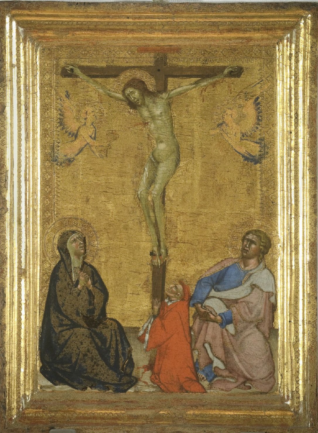 - NOTIZIE STORICO CRITICHE Del dipinto non si conosce la provenienza registrato però nella Quadreria dell'Accademia di Belle Arti probabilmente a seguito delle demaniazioni del 1810 e forse identificabile con la "Crocifissione dipinta di maniera antica" (BAP, Indice generale Accademia, 1821). La piccola figura ai piedi del Crocifisso raffigura il cardinale che commissionò l'opera per sua devozione personale. L'opera venne attribuita al senese Niccolò di Buonaccorso da Van Marle (1934). La tavoletta viene però esclusa dal corpus del pittore, specializzato in piccole opere devozionali, da Pia Palladino , sembra escludere la tavoletta, forse da riferire a uno degli artisti gravitanti in quello stesso milieu culturale, quali Bartolo di Fredi, Francesco di Vannuccio e Paolo di Giovanni Fei intorno al nono decennio del secolo. Un'altra proposta è stata avanzata da Marina Subbioni (2003) che riconduce l'esecuzione il dipinto all'ambiente perugino di Pellino di Vannuccio, espungendola quindi dal catalogo di Niccolò di Buonaccorso