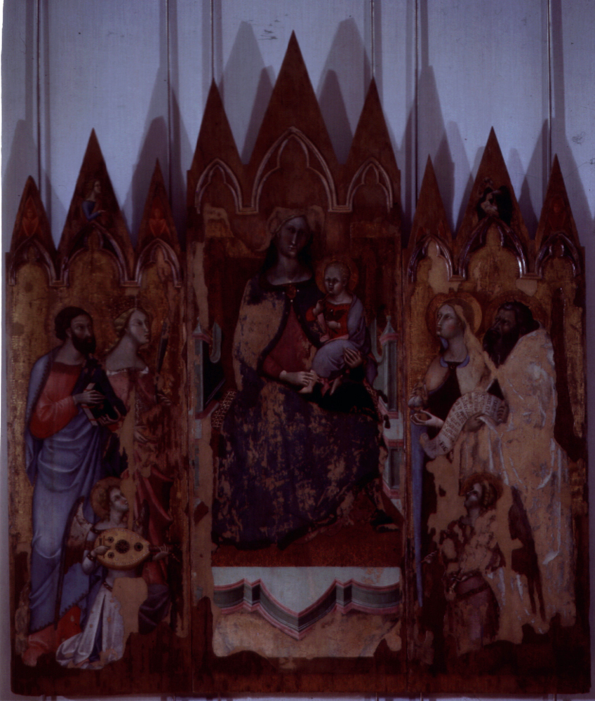 - NOTIZIE STORICO CRITICHE Il trittico venne indemaniato nel 1810 dalla chiesa dei Santi Simone e Giuda (o del Carmine) e trasferito nel Museo dell'Accademia di Belle Arti, quindi passò in Pinacoteca con l'ascrizione a Lorenzo Monaco (Carattoli 1878). Concordemente attribuito dalla critica a Bartolo di Fredi (cfr. Santi 1969, pp. 98-99), il dipinto va cronologicamente collocato, per ragioni stilistiche, tra il 1364, anno in cui Bartolo esegue la Madonna della Misericordia di Pienza, e il 1367, quando realizza gli affreschi della Collegiata di San Gimignano (cfr. Garibaldi, 2015, pp. 261-262 con bibliografia precedente). Riguardo alla individuazione dei santi, già Carattoli indicava in Elia il profeta nello scomparto destro. Recentemente tale identificazione è stata riproposta da Pierini (2021, pp. 46-48, fig. 5) che specifica il riferimento a 1 Re 18, 19 ("Su, con un ordine raduna tutto Israele presso di me sul monte Carmelo insieme con i quattrocentocinquanta profeti di Baal e con i quattrocento profeti di Asera, che mangiano alla tavola di Gezabele"); riconosce inoltre nell'apostolo collocato di fronte, Simone, legandolo alla provenienza accertata del trittico della Chiesa del Carmine (o dei santi Simone e Giuda). Ai piedi dei due gruppi laterali, due angeli musicanti, uno dei quali suona l'oud, strumento arabo antesignano del liuto; l'altro, la viella, appena distinguibile dall'arco e dalla posizione nello spazio