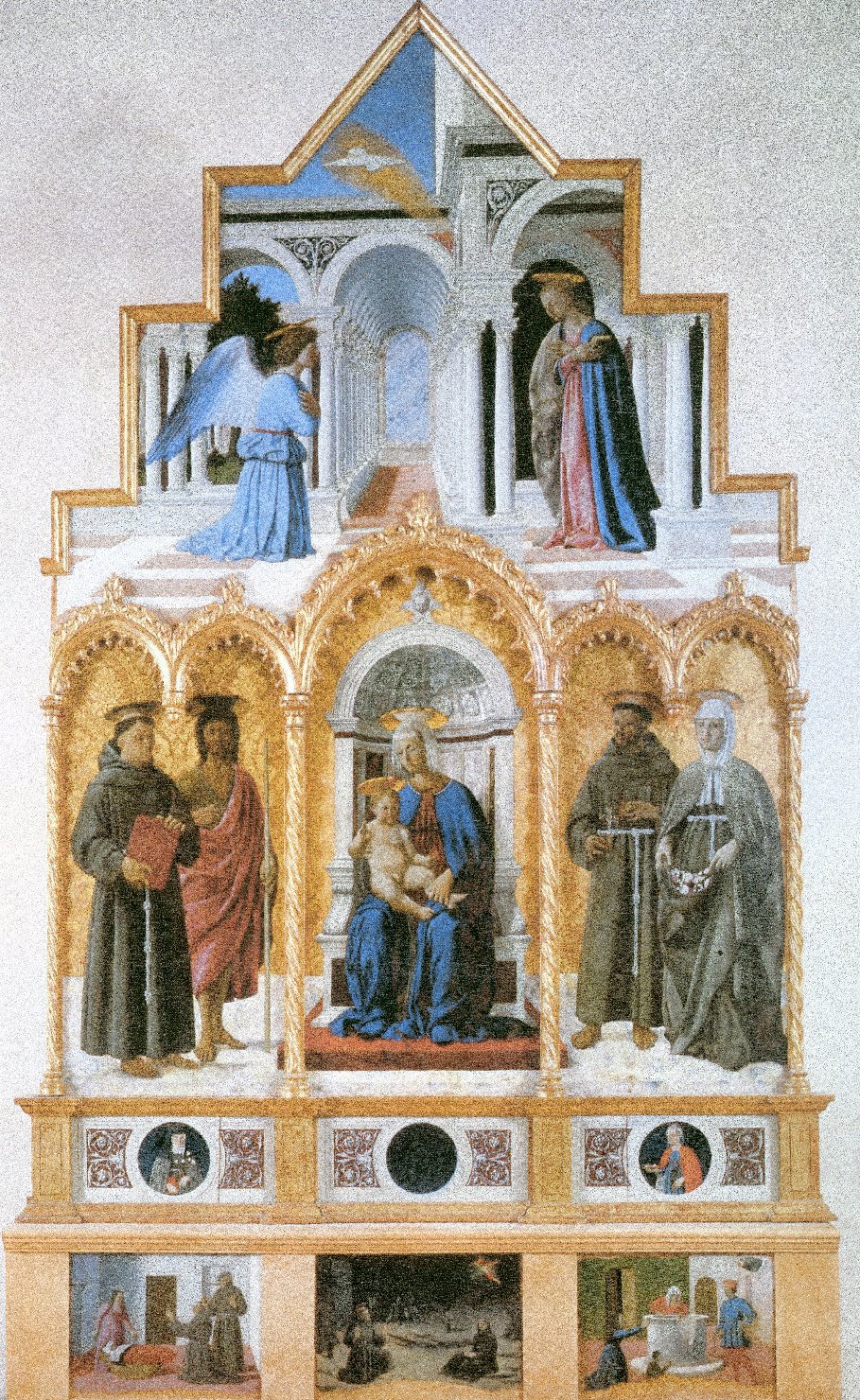 - NOTIZIE STORICO CRITICHE L'opera proviene dal monastero delle terziarie francescane di sant'Antonio in porta sant'Angelo a Perugia, profondamente ristrutturato intorno alla metà del XV secolo. Il primo allontanamento del polittico dal complesso originario avvenne nel 1799 per volontà del Vermiglioli che ne consigliò il trasferimento all'interno del palazzo dei Priori, tre anni più tardi, con la restaurazione del governo pontificio, il dipinto tornò nel convento di sant'Antonio, per essere definitivamente rimosso nel 1810 e trasferito nella Pinacoteca Vannucci, ancora situata all'interno del monastero olivetano di Montemorcino Nuovo. Finalmente nel 1885 il polittico, completo in ogni sua parte (due tavolette di predella erano entrate nel mercato antiquario e furono recuperate solo nel 1871), veniva collocato nella nuova sede della Pinacoteca, all'interno del Palazzo dei Priori. Il riassemblaggio della complessa macchina d'altare avvenne nei primi anni venti di questo secolo, i restauri successivi hanno mantenuto pressoché intatta la forma ipotizzata in quella occasione, fino all'ultimo intervento che, dopo aver eliminato le cornici ottocentesche ha ricreato la struttura scatolare della predella inferiore con funzione di sostegno, dove sono stati inseriti i tre miracoli. Le vicende storiche e critiche relative all'opera sono molto complesse, visto che fin dal 1608 venne rimossa dalla sua collocazione originaria (altare maggiore) e l'originalità della sua struttura che ha portato alla formulazione di numerose congetture sulla sua forma originaria. La grande pala venne commissionata dalle monache francescane tra l'inizio dei lavori di abbellimento del convento databili intorno 1455 circa e il 1468, anno riportato su un documento, riguardante la concessione da parte del Comune di Perugia di 15 fiorini alle monache di sant'Antonio per il pagamento di una tavola già eseguita, da riferire, secondo Mancini, a quella di Piero della Francesca. Essa era collocata sopra l'altare maggiore della "chiesa esterna", così chiamata per differenziarla da quella "interna", costruita poco dopo, la cui abside poligonale si andava a contrapporre a quella più antica. Le due chiese avevano dei passaggi laterali che permettevano la comunicazione, in quella interna venne collocata la pala di Raffaello, tolta poi nel 1678 circa. Il polittico di Piero della Francesca fino al 1566 (anno in cui Vasari è impegnato nella chiesa di san Pietro a Perugia) si trovava ancora sopra l'altare maggiore, nel 1698 venne rimosso per far posto alla tela con lo Sposalizio di santa Caterina, di Vincenzo Pellegrini. Più tardi è ricordato dal Lancellotti in sagrestia, probabilmente in questa occasione vennero smontate e rimosse alcune parti (la cornice della cimasa, i pilastri laterali e la predella inferiore). Alla fine degli anni settanta del XVII secolo il polittico venne trasportato sopra l'altare maggiore della "chiesa interna", dove rimase per oltre un secolo al posto della tavola di Raffaello. Anche questa sistemazione fu traumatica per il dipinto, che subì ulteriori modificazioni. Infatti, non essendo più in grado di sostenersi da solo, avendogli tolto la predella inferiore che aveva una funzione di sostegno, questo venne addossato alla parete, la quale presentava al centro una apertura che metteva in comunicazione le due chiese (mentre i due passaggi laterali erano stati chiusi). Tutto ciò provocò l'asportazione dello sportellino mobile (scomparto centrale della predella) e l'ampliamento dell'apertura. Dopo la citazione vasariana il polittico, stranamente, non godette di particolare fortuna nell’ambito della storiografia locale. Spetta al Witting il primo studio approfondito sul grande dipinto, anche se con alcune ipotesi oggi inaccettabili, come l'appartenenza delle varie tavole che lo compongono a due distinti polittici. L'Aubert, seguito da tutta la critica successiva, ritenne invece unitario il complesso; dato confermato anche dall'ultimo restauro, che ha evidenziato la presenza della tracciatura delle tavole con battitura di filo e a graffietto, indubbiamente riconducibile ad un progetto unitario e dettagliato della macchina d 'altare. Anche la fase successiva, quella della realizzazione pittorica, risulta unitaria, con l'adozione di tecniche diverse e con l'utilizzo di vari tipi di trasposizione del disegno a seconda delle necessità dell'artista. Garibaldi nel 1994 ha proposto per l'opera una datazione molto vicina al 1459, anno in cui Piero si recò a Roma, dove deve aver conosciuto anche la pittura fiamminga come dimostrerebbero la croce di cristallo in mano a san Francesco, l'ampolla di vetro, le perle della Madonna e le riflettenti aureole dorate (per un riesame completo dell’opera cfr. Garibaldi, 2015, pp. 387-398 con bibliografia precedente)