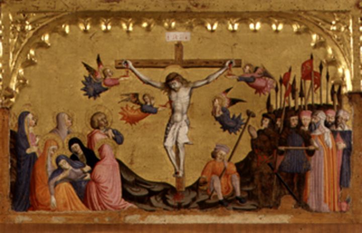 - NOTIZIE STORICO CRITICHE Le tavolette raffiguranti l'Andata al Calvario e la Deposizione, provenienti secondo Lupattelli (1885, p.14) dalla sacrestia di San Francesco al Prato, sono passate dall'Accademia di Belle Arti alla Pinacoteca. La Crocifissione, invece, fu rintracciata da Carattoli presso Luigi Benucci dei cui beni successivamente redasse una stima datata 27 gennaio 1866. In essa si dichiarava "[...] che i quadri portanti il numero 35 e 36 furono venduti dalla b.m. Sig. Luigi Benucci al Municipio di Perugia nel settembre 1865 per la somma di £ 100". Le opere erano: "35: Una tavoletta ["in campo d'oro" cancellato] dipinta a tempera rappr. la Crocifissione lavoro del secolo XV; 36) Quadro in tela ad olio rappresentante il ritratto di Leonardo Balestrini di Perugia." Di quest'ultimo non c'è traccia negli inventari poiché sucessivamente venne consegnato ai parenti dell'effigiato. Le due tavolette con Andata al Calvario; Deposizione e Resurrezione, erano state consegnate dalla cassa Ecclesiastica dello Stato al Municipio il 18 Agosto 1862 (Garibaldi, 2015, p. 351). Scarpellini (1975, pp.583-584) ne propone l'attribuzione a Mariano d'Antonio e suggerisce di identificarvi, come nelle Storie di Sant'Antonio da Padova (inv.117-122) e nei Santi Giovanni Battista e Bernardino, ciò che rimane dell'altare Montesperelli in San Francesco al Prato, eseguito dall'artista nel 1455 su commissione di Giovanni di Petruccio Montesperelli. La proposta attributiva è stata accolta da Santi (1985, pp.32-33), Todini (1989, I, p.207, II, fig.759), Lunghi (1996, p.40) e Silvestrini (1996, p.56). Quest'ultima, tuttavia, respinge l'ipotesi di appartenenza all'altare Montesperelli delle Storie della Passione (inv.115), evidenziando sensibili differenze nello spessore delle due serie di tavole, nel tipo di punzoni impiegati e negli intagli delle cornici (per un riesame completo dell’opera cfr. Garibaldi, 2015, pp. 349-356). La appartenza della predella alla Pala Montesperelli è invece confermata da Zappasodi (Autunno del Medioevo, p. 31, fig. 24 dove è proposto un grafico della ipotetica ricostruzione)