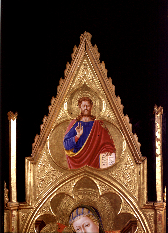 - NOTIZIE STORICO CRITICHE Il dipinto fu realizzato per il monastero di Santa Giuliana di Perugia su commissione della famiglia Buccoli, alla fine del XVIII secolo si trovava nel coro, nel 1818 fu trasferito in sagrestia, dove lo vide il Siepi ed infine nel 1863 venne riportato nel coro. La presenza del globo trasparente in mano al Bambino in cui è raffigurato in grisaille il castello di Sant’Egidio al Colle, è stato interpretato come una rivendicazione della giurisdizione temporale sul piccolo borgo, contesa tra Santa Giuliana e il monastero rivale di San Francesco al Prato. Si tratta di uno dei rari dipinti firmati e datati del pittore senese dai complessi riferimenti culturali. Aggiornato sulle novità fiorentine della pittura di luce di Domenico Veneziano, del plasticismo di Filippo Lippi e delle sperimentazioni in scultura di Donatello e Luca della Robbia, nell’arco della sua carriera si esprime nel pieno della comprensione delle rivoluzionarie novità del primo Rinascimento, alternando momenti di maggiore adesione ad immagini più tradizionali, come in questo caso, su richiesta di committenze ancora legate a retaggi trecenteschi, qui visibili sul piano tecnico-costruttivo. La melanconica e intima concentrazione della Vergine si smorza nelle primaverili tonalità cromatiche, nel gioco dei richiami dei gesti dei santi, nella ricchezza delle vesti e nei bagliori di luce, forse suggestionato dalle prove del Veneziano che, nello stesso anno, decora con gli Uomini illustri una sala del palazzo perugino di Braccio Baglioni. Le storie della predella, caratterizzate da un intenso realismo descrittivo, espresso da una non comune attenzione al ritratto, come quello del personaggio in verde nella Predica del Battista, sono state avvicinate a Priamo della Quercia, fratello di Jacopo e collaboratore documentato del Ghezzi (per un riesame completo dell’opera cfr. Garibaldi, 2015, pp. 340-343)