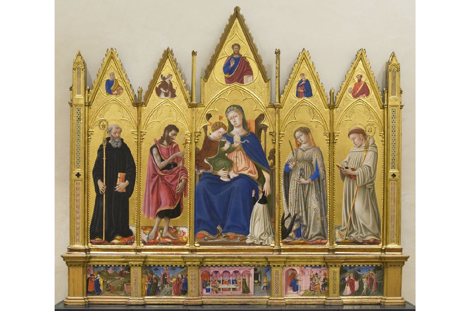 - NOTIZIE STORICO CRITICHE Il dipinto fu realizzato per il monastero di Santa Giuliana di Perugia su commissione della famiglia Buccoli, alla fine del XVIII secolo si trovava nel coro, nel 1818 fu trasferito in sagrestia, dove lo vide il Siepi ed infine nel 1863 venne riportato nel coro. La presenza del globo trasparente in mano al Bambino in cui è raffigurato in grisaille il castello di Sant’Egidio al Colle, è stato interpretato come una rivendicazione della giurisdizione temporale sul piccolo borgo, contesa tra Santa Giuliana e il monastero rivale di San Francesco al Prato. Si tratta di uno dei rari dipinti firmati e datati del pittore senese dai complessi riferimenti culturali. Aggiornato sulle novità fiorentine della pittura di luce di Domenico Veneziano, del plasticismo di Filippo Lippi e delle sperimentazioni in scultura di Donatello e Luca della Robbia, nell’arco della sua carriera si esprime nel pieno della comprensione delle rivoluzionarie novità del primo Rinascimento, alternando momenti di maggiore adesione ad immagini più tradizionali, come in questo caso, su richiesta di committenze ancora legate a retaggi trecenteschi, qui visibili sul piano tecnico-costruttivo. La melanconica e intima concentrazione della Vergine si smorza nelle primaverili tonalità cromatiche, nel gioco dei richiami dei gesti dei santi, nella ricchezza delle vesti e nei bagliori di luce, forse suggestionato dalle prove del Veneziano che, nello stesso anno, decora con gli Uomini illustri una sala del palazzo perugino di Braccio Baglioni. Le storie della predella, caratterizzate da un intenso realismo descrittivo, espresso da una non comune attenzione al ritratto, come quello del personaggio in verde nella Predica del Battista, sono state avvicinate a Priamo della Quercia, fratello di Jacopo e collaboratore documentato del Ghezzi (per un riesame completo dell’opera cfr. Garibaldi, 2015, pp. 340-343)
