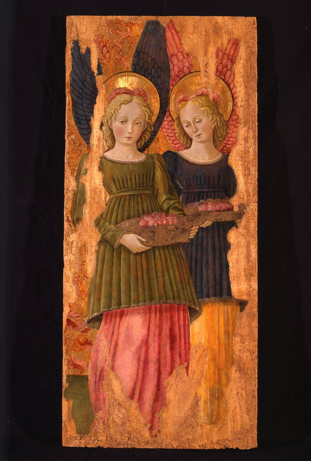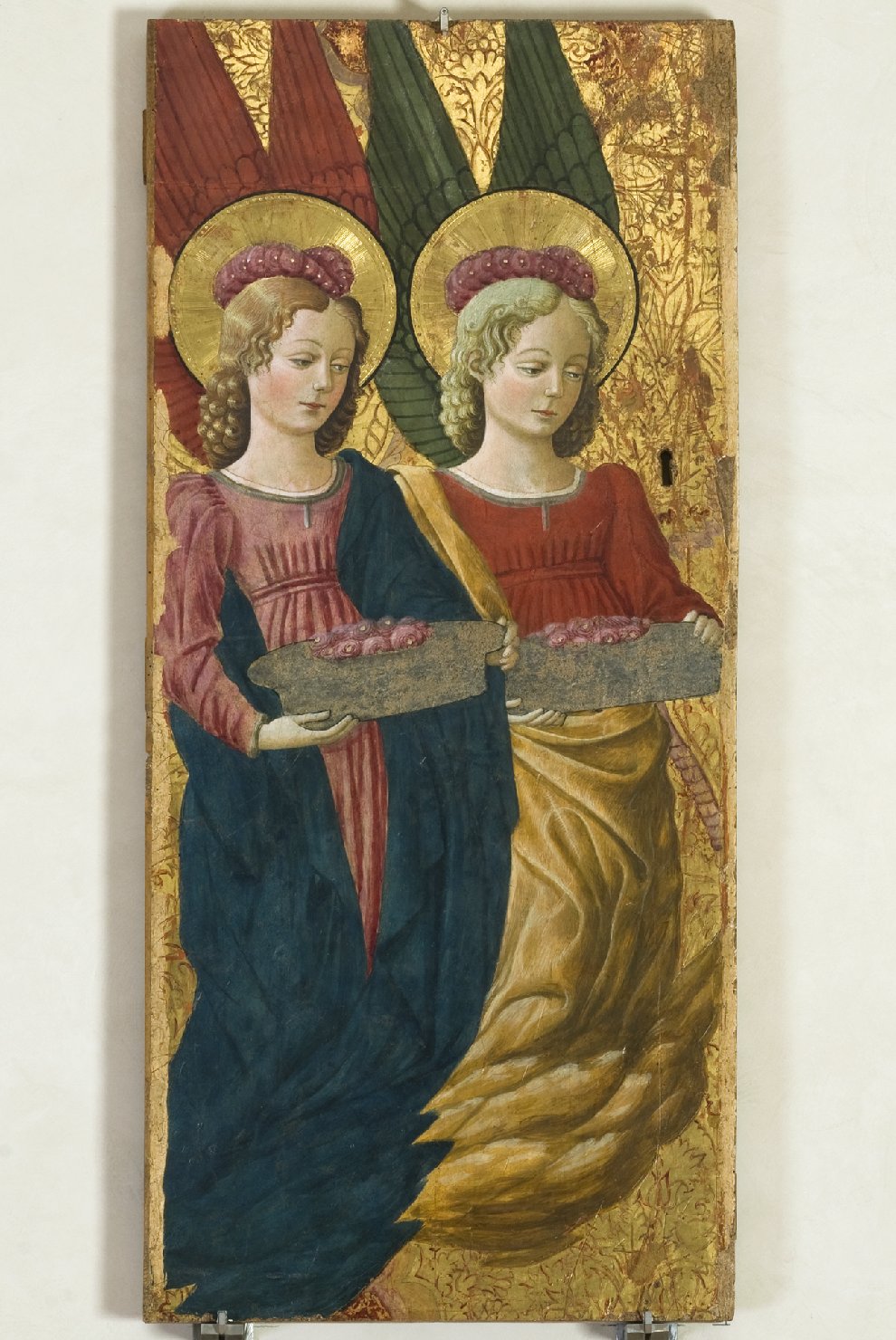 • NOTIZIE STORICO CRITICHE La tavola, insieme ad una analoga (inv. 167), è giunta in Galleria a seguito delle demaniazioni postunitarie ed era precedentemente conservata nella confraternita della Giustizia o di San Bernardino attigua alla chiesa di San Francesco al Prato. La serie di otto Angeli che offrono rose in vassoi è completata da altre due tavole (inv. 171-172, recano sul retro il sigillo del pio sodalizio) esposte verosimilmente fino al 1909 nella cappella del Gonfalone (Santi, 1985, pp. 44-45 con bibliografia precedente). Mancini (1992, pp. 76, 114-115 con bibliografia precedente) ha ipotizzato che le quattro tavole possano aver costituito le ante di una cassa costruita per proteggere il Gonfalone dipinto da Bonfigli nel 1464 per la Compagnia omonima che aveva un proprio altare in San Francesco al Prato (cfr. Mercurelli Salari, 1996, p. 150). L'esame dei supporti e del gioco di luci ed ombre induce, invece, Mercurelli Salari (1996, p. 154) a ritenere che le tavole potessero costituire una sorta di macchina d'altare intorno al suddetto gonfalone, collocandosi non su un unico piano ma in modo da formare una sorta di nicchia. La loro datazione intorno al 1465 si basa, oltre che sul raffronto stilistico con gli angeli dipinti nel gonfalone di San Bernardino (1465) , su un dato documentario relativo allo stanziamento effettuato dal Comune nel 1466 "pro ornamentis capella dicti gonfalonis et tabernaculi eiusdem". Secondo Mazzalupi (Altra Galleria, 2022, pp. 256-253) l'insieme doveva essere costituito dalle quattro tavolette (invv. 165, 167, 171, 172), dal gonfalone ora in San Bernardino, dal celetto inv. 173 e dalla lunetta inv. 159, realizzata dal bonfigliesco Maestro della Pietà di San Costanzo