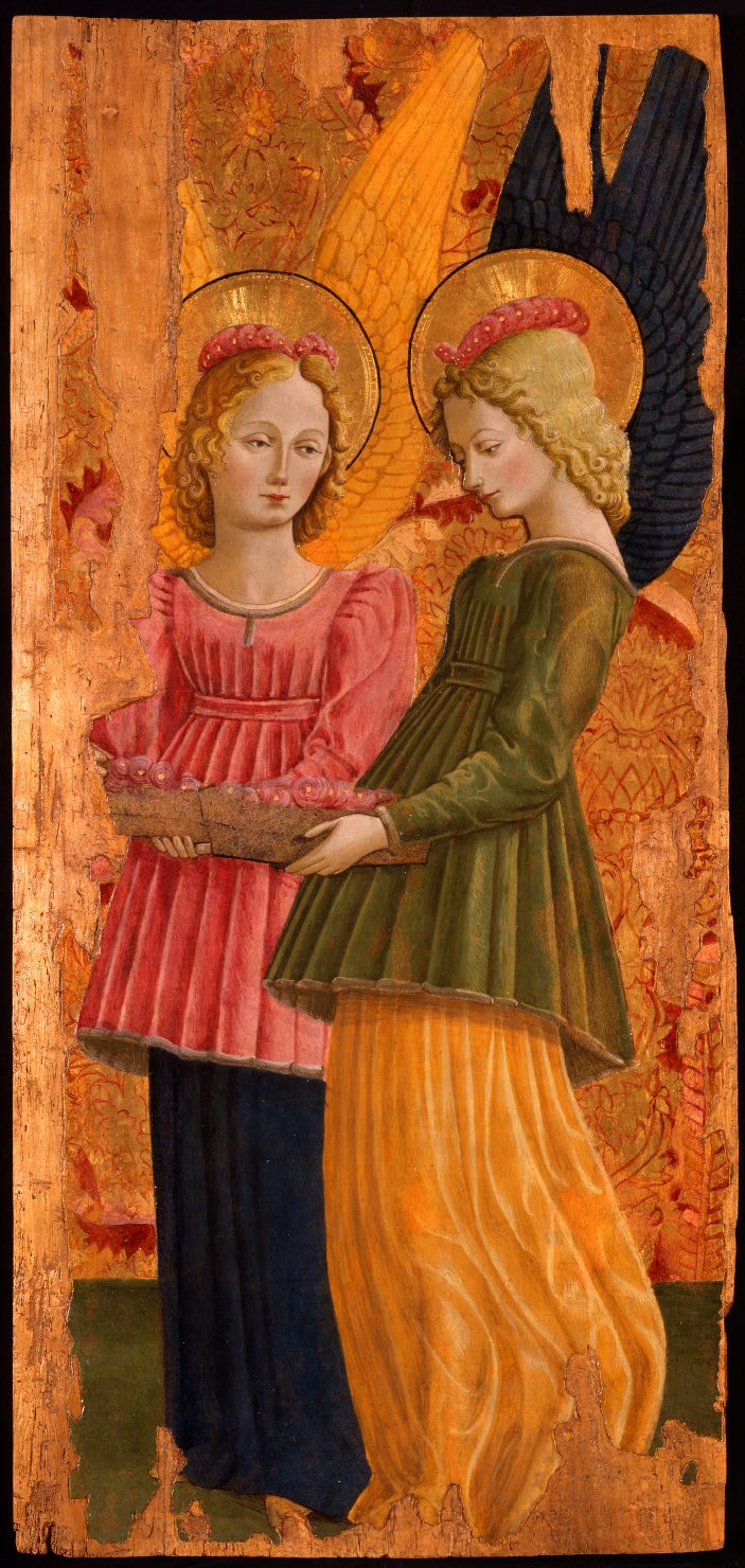 - NOTIZIE STORICO CRITICHE La tavola, insieme ad una analoga (inv. 167), è giunta in Galleria a seguito delle demaniazioni postunitarie ed era precedentemente conservata nella confraternita della Giustizia o di San Bernardino attigua alla chiesa di San Francesco al Prato. La serie di otto Angeli che offrono rose in vassoi è completata da altre due tavole (inv. 171-172, recano sul retro il sigillo del pio sodalizio) esposte verosimilmente fino al 1909 nella cappella del Gonfalone (Santi, 1985, pp. 44-45 con bibliografia precedente). Mancini (1992, pp. 76, 114-115 con bibliografia precedente) ha ipotizzato che le quattro tavole possano aver costituito le ante di una cassa costruita per proteggere il Gonfalone dipinto da Bonfigli nel 1464 per la Compagnia omonima che aveva un proprio altare in San Francesco al Prato (cfr. Mercurelli Salari, 1996, p. 150). L'esame dei supporti e del gioco di luci ed ombre induce, invece, Mercurelli Salari (1996, p. 154) a ritenere che le tavole potessero costituire una sorta di macchina d'altare intorno al suddetto gonfalone, collocandosi non su un unico piano ma in modo da formare una sorta di nicchia. La loro datazione intorno al 1465 si basa, oltre che sul raffronto stilistico con gli angeli dipinti nel gonfalone di San Bernardino (1465) , su un dato documentario relativo allo stanziamento effettuato dal Comune nel 1466 "pro ornamentis capella dicti gonfalonis et tabernaculi eiusdem". Secondo Mazzalupi (Altra Galleria, 2022, pp. 256-253) l'insieme doveva essere costituito dalle quattro tavolette (invv. 165, 167, 171, 172), dal gonfalone ora in San Bernardino, dal celetto inv. 173 e dalla lunetta inv. 159, realizzata dal bonfigliesco Maestro della Pietà di San Costanzo
