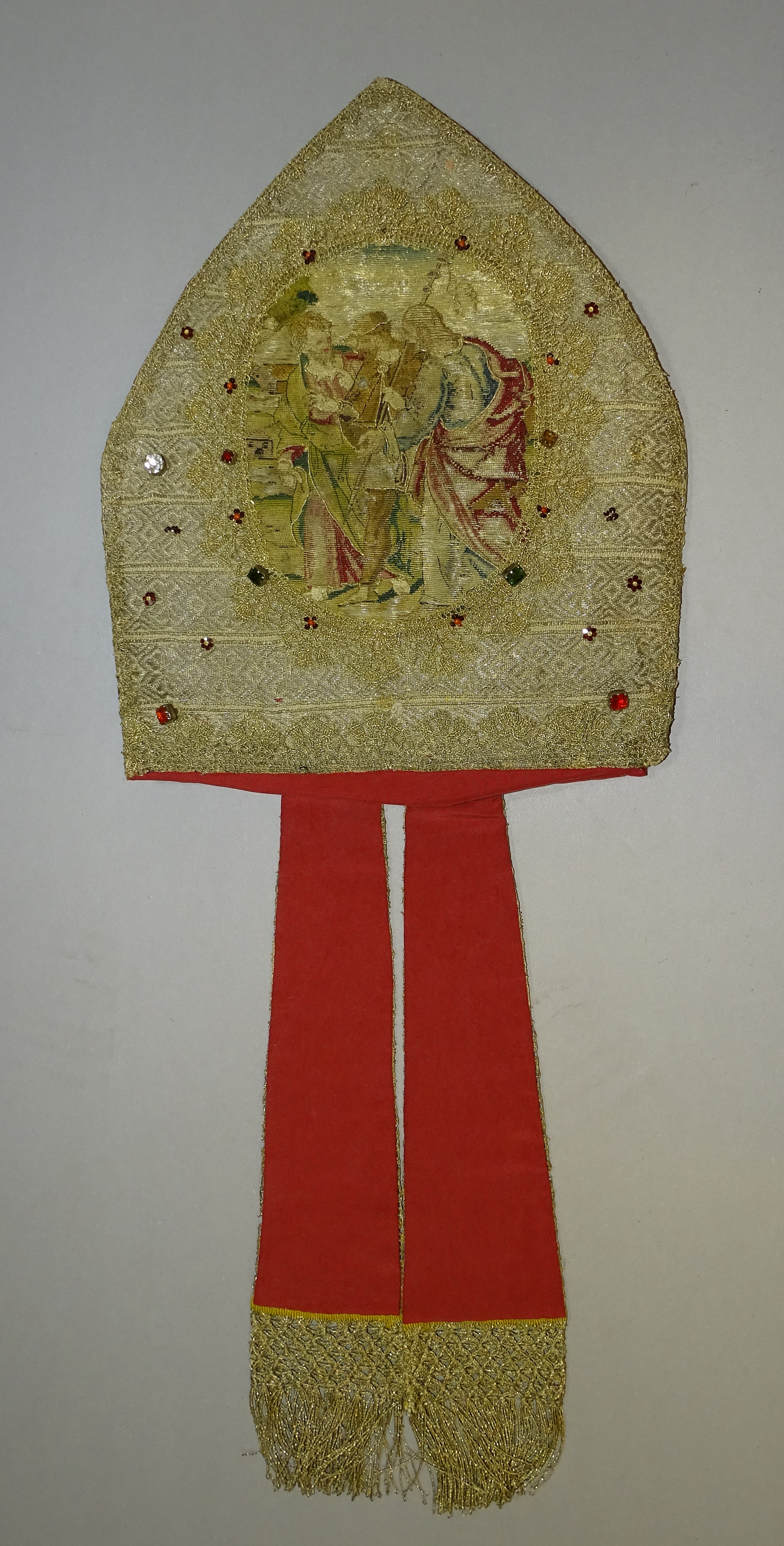 La mitria risulta dall'unione di galloni eseguiti in seta e filati metallici cuciti uno accanto all'altro. Il ricamo è eseguito con la tecnica "ornuè" (oro velato o smalto traslucido)