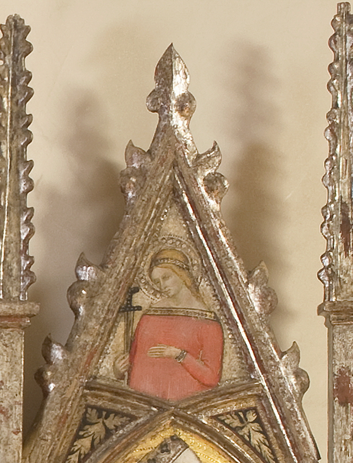 - NOTIZIE STORICO CRITICHE Il pentittico proviene dalla chiesa parrocchiale di Sant’Apollinare a Forsivo di Norcia dove all'inizio del secolo le tavole laterali erano esposte in chiesa, mentre la centrale faceva da fondo in un armadio di sacrestia. Quest'ultima fu venduta illecitamente nel 1920 ad un antiquario. L'opera fu scoperta mel 1921 da Umberto Gnoli; recuperata nel 1924, con decreto del Ministero della Pubblica Istruzione che ne stabiliva l'inscindibilità dalle tavole laterali, il pentittico fu trasferito nella pinacoteca di Spoleto. Nel 1942 lo Stato acquistava l'opera dalla Comunanza Agraria di Forsivo e ne decretava nel 1951 il passaggio in Galleria a Perugia. La presenza di opere d’arte di area toscana nel territorio di Norcia e di Preci fu dal tardo Medioevo all’età moderna un fenomeno importante tanto da far parlare di un’isola toscana in questa zona (cfr. Garibaldi 2015, pp. 265-267 con bibliografia precedente). Concordemente riferita dalla critica a Luca di Tommè, anche in virtù della firma, seppur frammentaria, l'opera è stata in genere collocata negli ultimi anni di attività dell'artista, presumibilmente in parallelo con il polittico n. 586 della Pinacoteca di Siena posteriore al 1370. Nella scheda del catalogo in Arti del Medioevo (2021, pp. 126-129), G. Fattorini la anticipa agli anni tra 1360 e 1362 "in virtù di un sentimento martiniano che addolcisce tutt ele figure e in particolare il volto delicato e allungato della Vergine […]". L'ultimo elemento a destra raffigura una santa martire, con l'attributo della spada, assegnabile sia alle martiri Barbara o Lucia