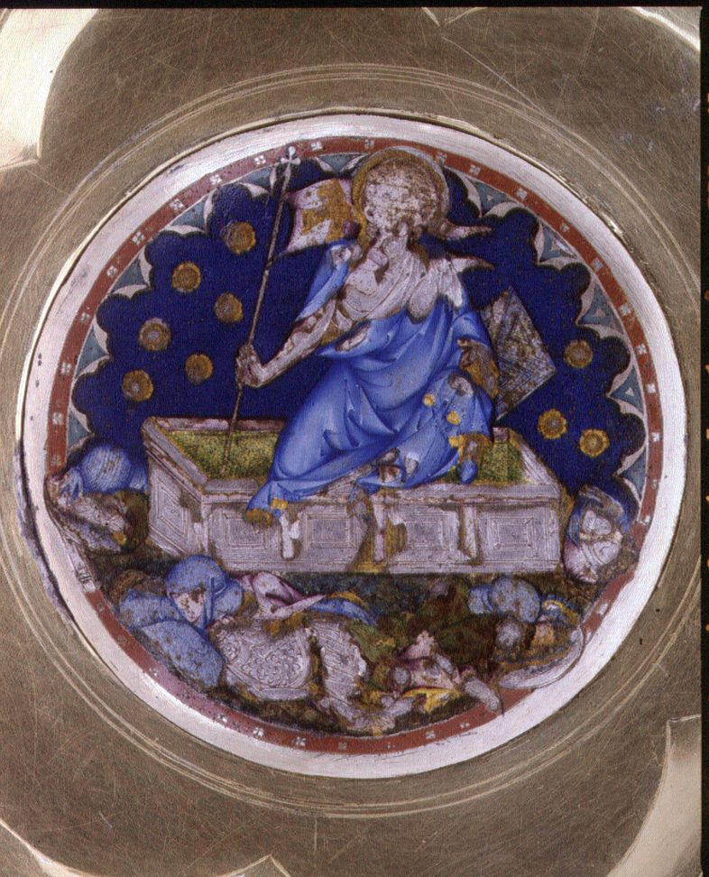 - NOTIZIE STORICO CRITICHE La patena fu casualmente rinvenuta, insieme ad altre oreficerie, il 9 dicembre 1955 sotto il pavimento dell'abside di San Domenico, dove fu probabilmente occultata prima del 1548 per non doverla vendere per pagare le forti tasse che vennero imposte al convento (Santi, 1969, pp.167-169 con bibliografia precedente). Santi ne propone l'attribuzione a Tondo e Andrea Riguardi da Siena in base ad un inventario della sacrestia di San Domenico dove per il calice corrispondente a questa patena è riportata la firma con il nome dei due orafi. Bologna (1973, p. 32) propone di datarla al 1322-1323. De Castris (1980, pp. 24-44) attribuisce ai due artisti soltanto questo lavoro e non anche la patena inv. 1015, generalmente considerate dalla critica di stessa mano, dove solo in via dubitativa vi riconosce il loro intervento