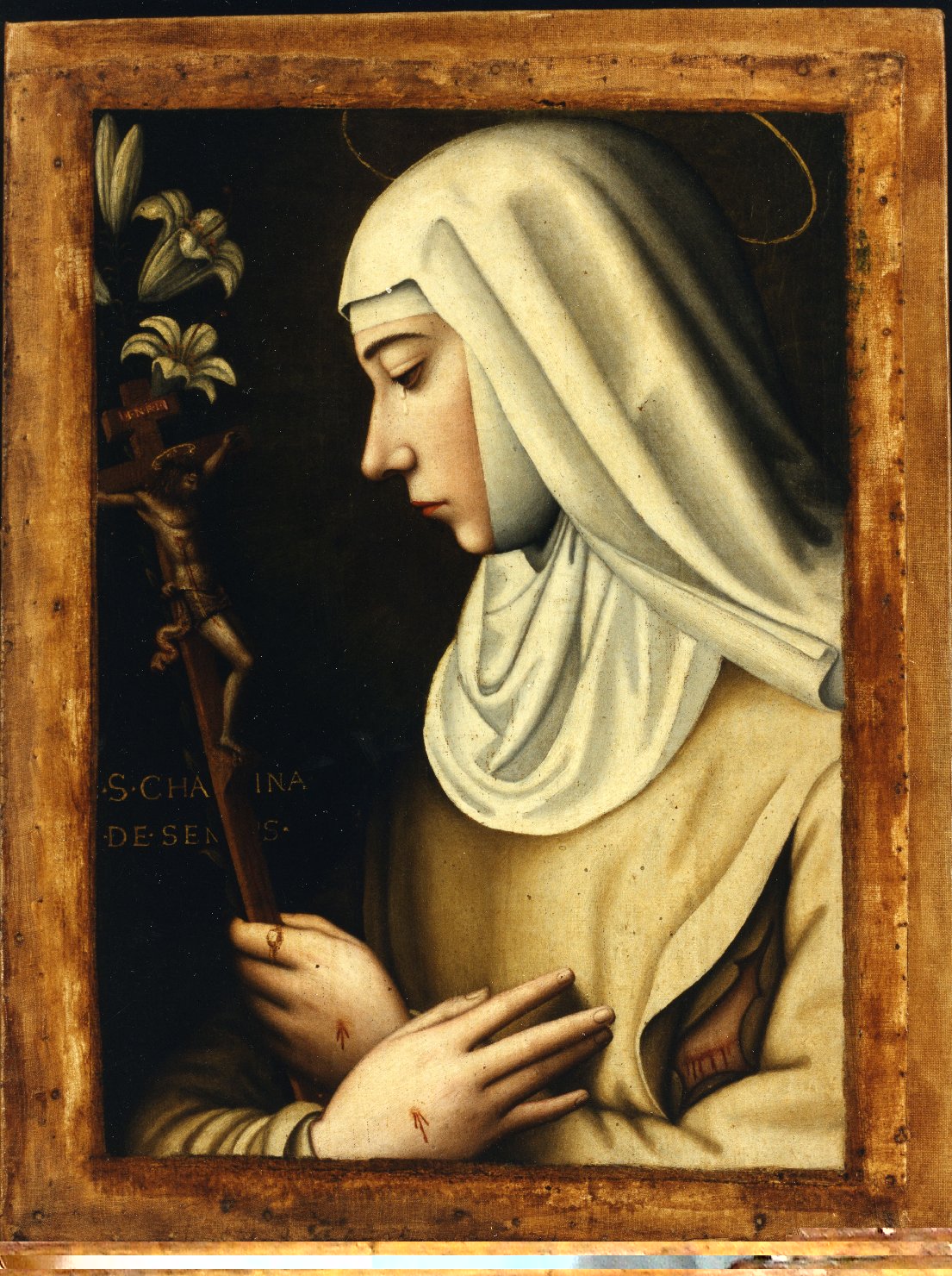 - NOTIZIE STORICO CRITICHE Il dipinto è da riconoscere in quello al numero 533 dell'Inventario della Galleria, descritto con "Tela dipinta ad olio, tirata su tavola rappresentante S. Caterina da Siena in mezza figura in profilo con le stigmate e crocifisso in mano. Alta m: 0,57 X 0,41 non compresa la cornice." La data e il nome che compaiono sul verso della tela non possono essere ricollegati al periodo di esecuzione e al probabile autore, semmai al possibile detentore del dipinto. Recentemente (2017) assegnata alla pittrice-monaca fiorentina, la tela "fa parte della serie di raffigurazioni di Santa Caterina da Siena dipinte con i sembianti di Caterina de' Ricci che furono realizzate da Plautilla e dalla sua bottega negli anni della piena maturità della carriera artistica…" (Navarro). Precedentemente era stata assegnata da Zeri (vedi catalogo Fondazione Zeri, n. 37337) ad anonimo senese del XVI secolo. La Nelli ricoprì in vari periodi la carica di priora del convento di Santa Caterina a Cafaggio dove fu a capo di una "officina sacra" con numerose allieve (vedi Scagliosi, scheda in Le Signore dell'Arte, 2021, p. 132)