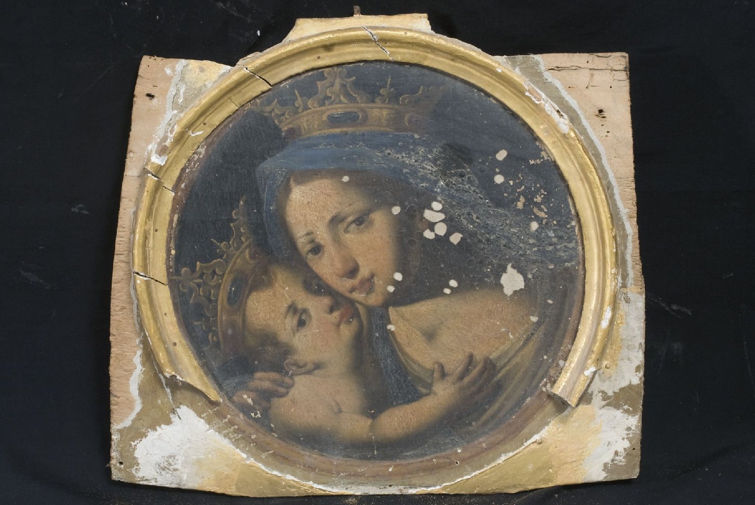 - NOTIZIE STORICO CRITICHE Il tondo forse inserito in un più ampio complesso, come lascia supporre la struttura quadrata in cui è inscritto, ripete l'iconografia tradizionale della Madonna con Bambino incoronati in atteggiamento affettuoso, canone pittorico tipico del tardo seicento. In prima approssimazione può essere attribuito alla mano di Pietro Montanini. Il dipinto mostra alcune affinità con un nobile prototipo, il tondo di bottega botticelliana conservato nella Galleria Palatina e Appartamenti Reali di Firenze (NCNT 0900296142, Inv. 1890, 3194) del quale esistono più versioni che, secondo la critica, si riferiscono ad un originale botticelliano non rintracciabile